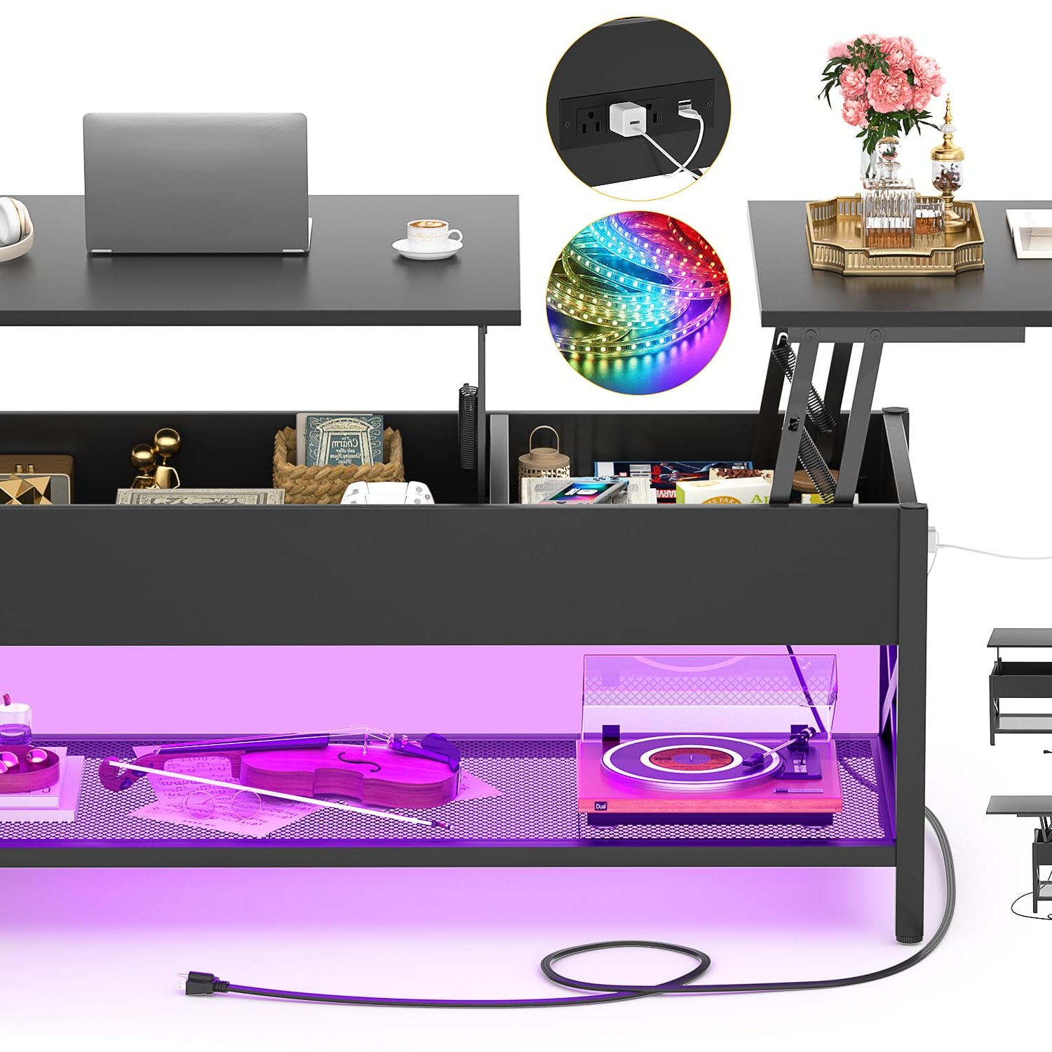 Details: Besiost Coffee Table, Lift Top Coffee Table with Storage, LED Light & Power Outlet and Hidden Compartment, Retro Center Table for Living Room