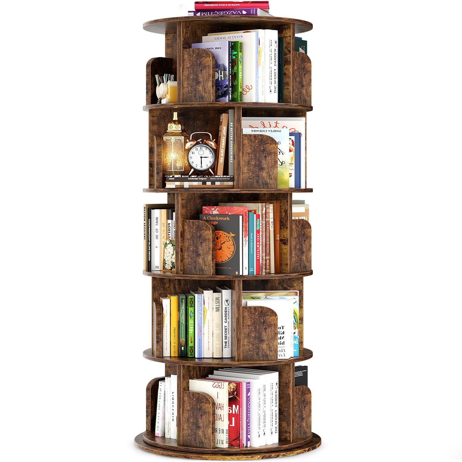 Besiost Rotating Bookshelf Tower, 5 Tier Spinning Bookcase, Revolving 360 Book Shelf Narrow Tall Bookcase, Vertical Turning Round Bookshelf Organizer, Corner Book Shelf for Small Space, Rustic Brown