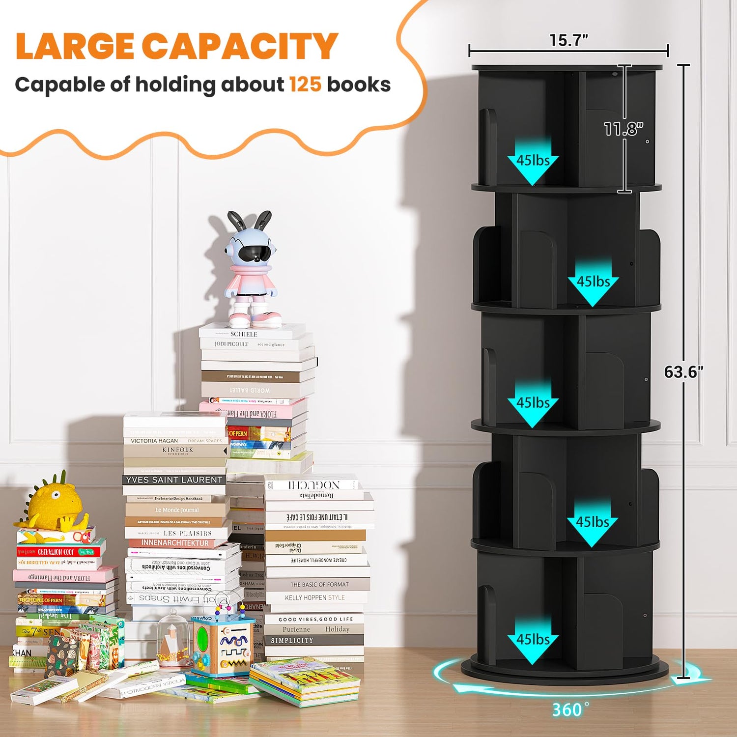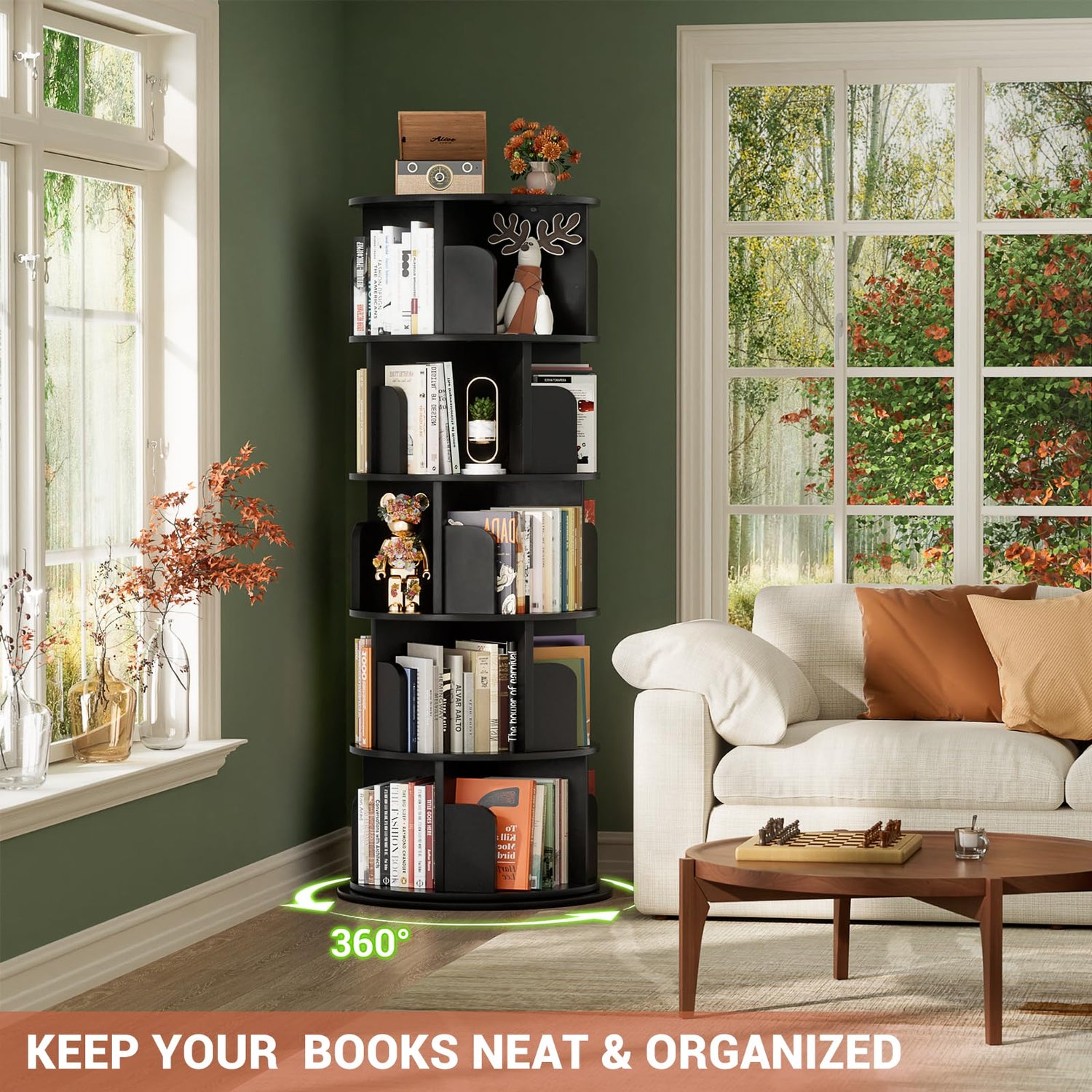 - 【Large Capacity】Our rotating bookshelf with 5-tier shelf and an open top shelf provide enough space for display and storage. 5 cubbies each tier that are perfect for displaying and organizing books, photo albums, plants, collections and knick-knacks. bookcase can hold about 100-125 medium-sized books, and make every room look like a small library.