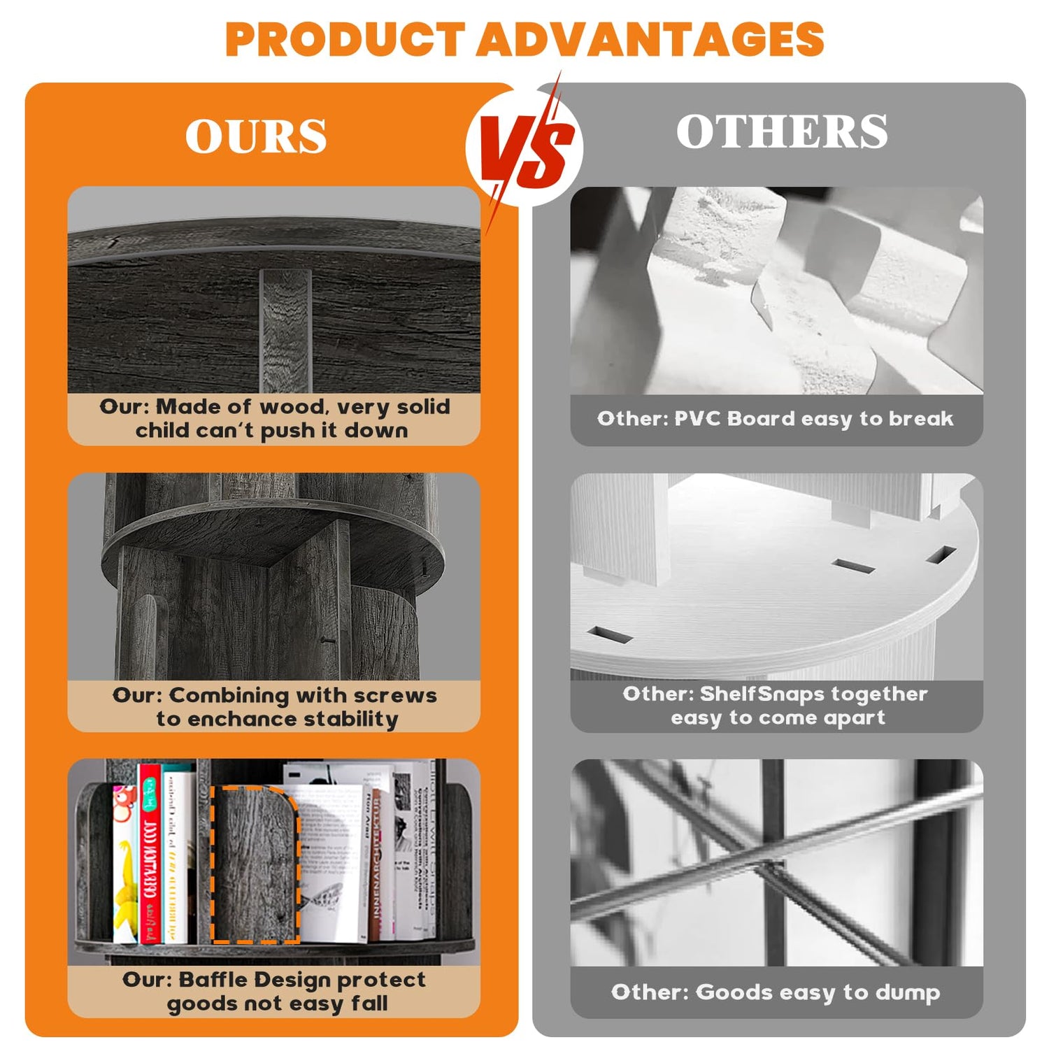 Constructed from high-quality E1 MDF Board and reinforced with metal screws, the Besiost bookshelf boasts impressive stability and durability. Once assembled, this rotating bookcase remains steadfast, eliminating any tilting or wobbling during use, ensuring that your items are always secure.