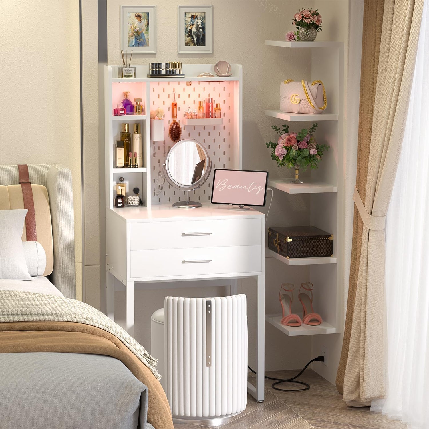 - Compact and Space Efficient - This little white makeup vanity with hutch has incredible storage for your daily needs. There are 2 drawers so you can use one drawer for makeup and the second drawer for additional jewelry. 4 shelves ( 2 of them are adjustable ) are nice for either extra storage or decoration. The pegboard with 6 hooks will help to organize and display your items.