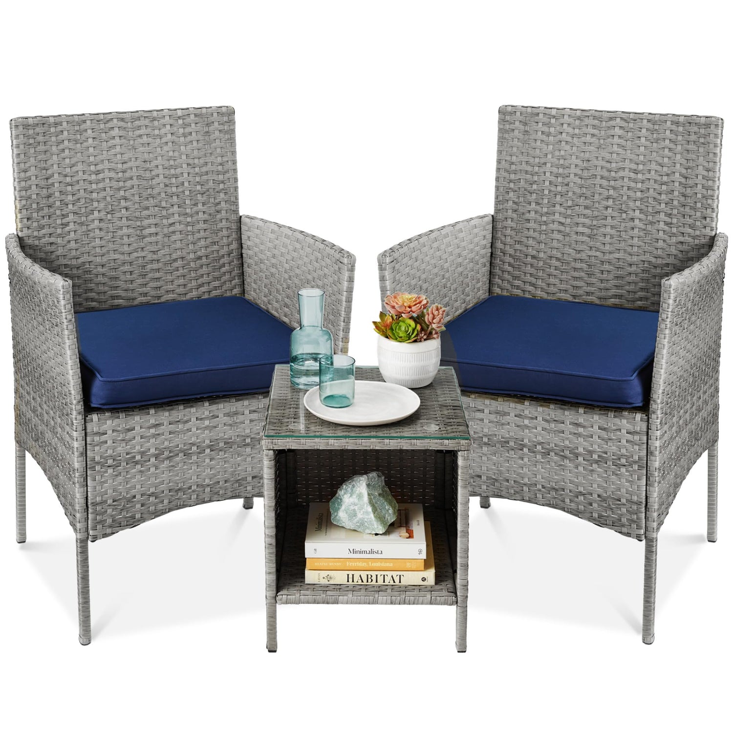 Best Choice Products 3-Piece Outdoor Wicker Conversation Bistro Set, Space Saving Patio Furniture for Garden w/Side Table - Gray/Navy