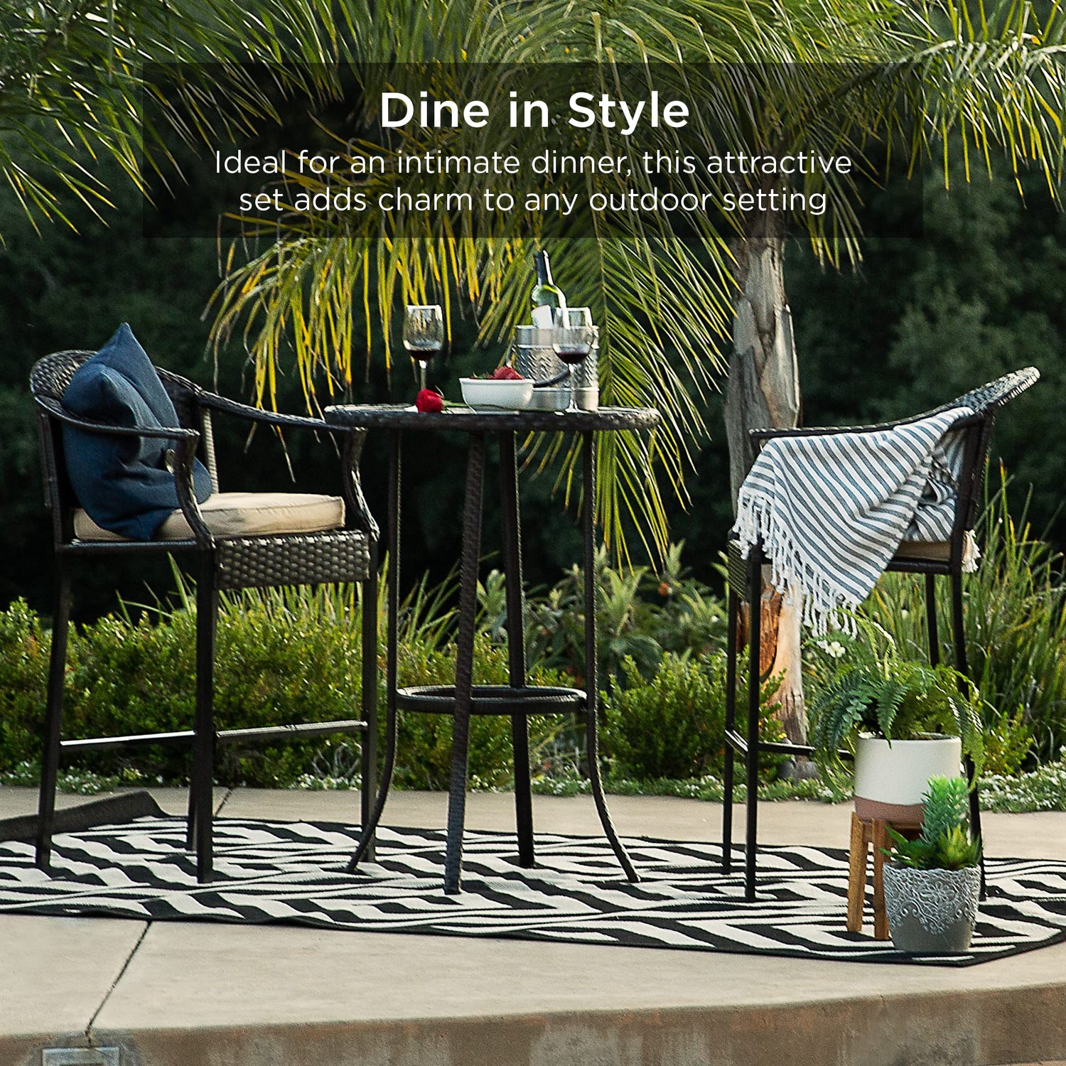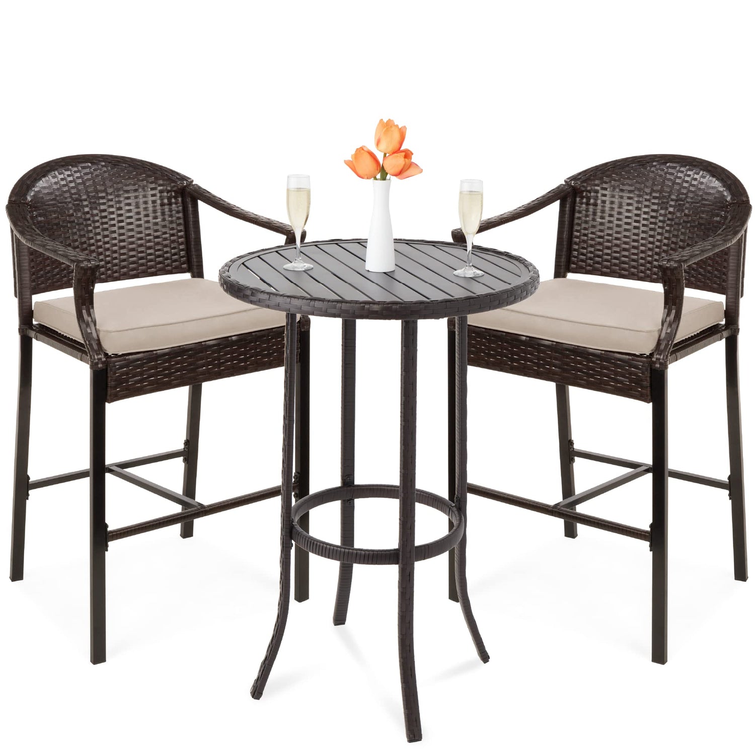 - 3-PIECE BAR HEIGHT SET: Composed of a bar-height table and 2 tall chairs, this outdoor set creates an intimate setting for any poolside, porch, deck, or patio setup