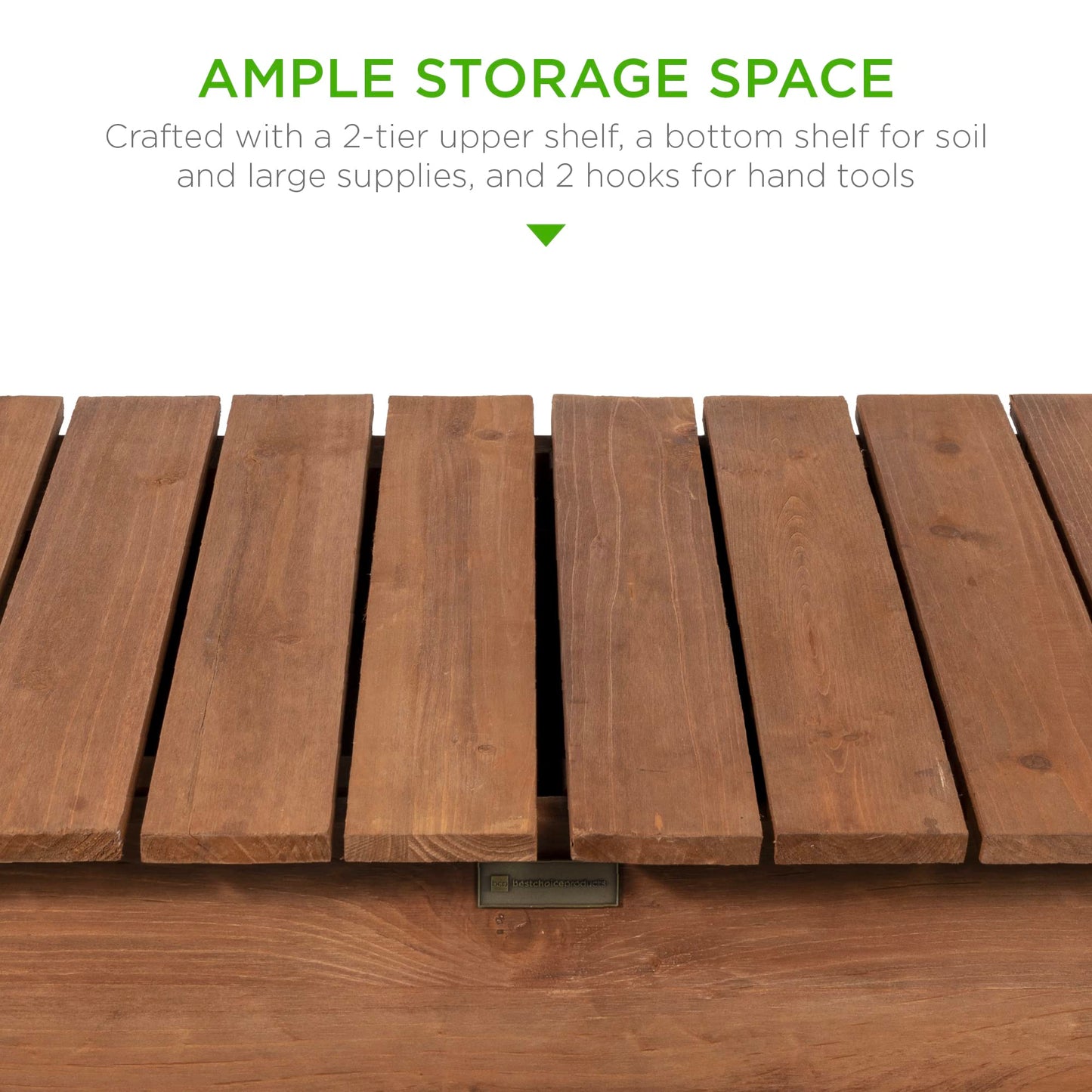 • AMPLE STORAGE SPACE: Keep all your gardening supplies close at hand with a 2-tier upper shelf, a bottom shelf for soil and other large supplies, and two hooks for your go-to hand tools!
