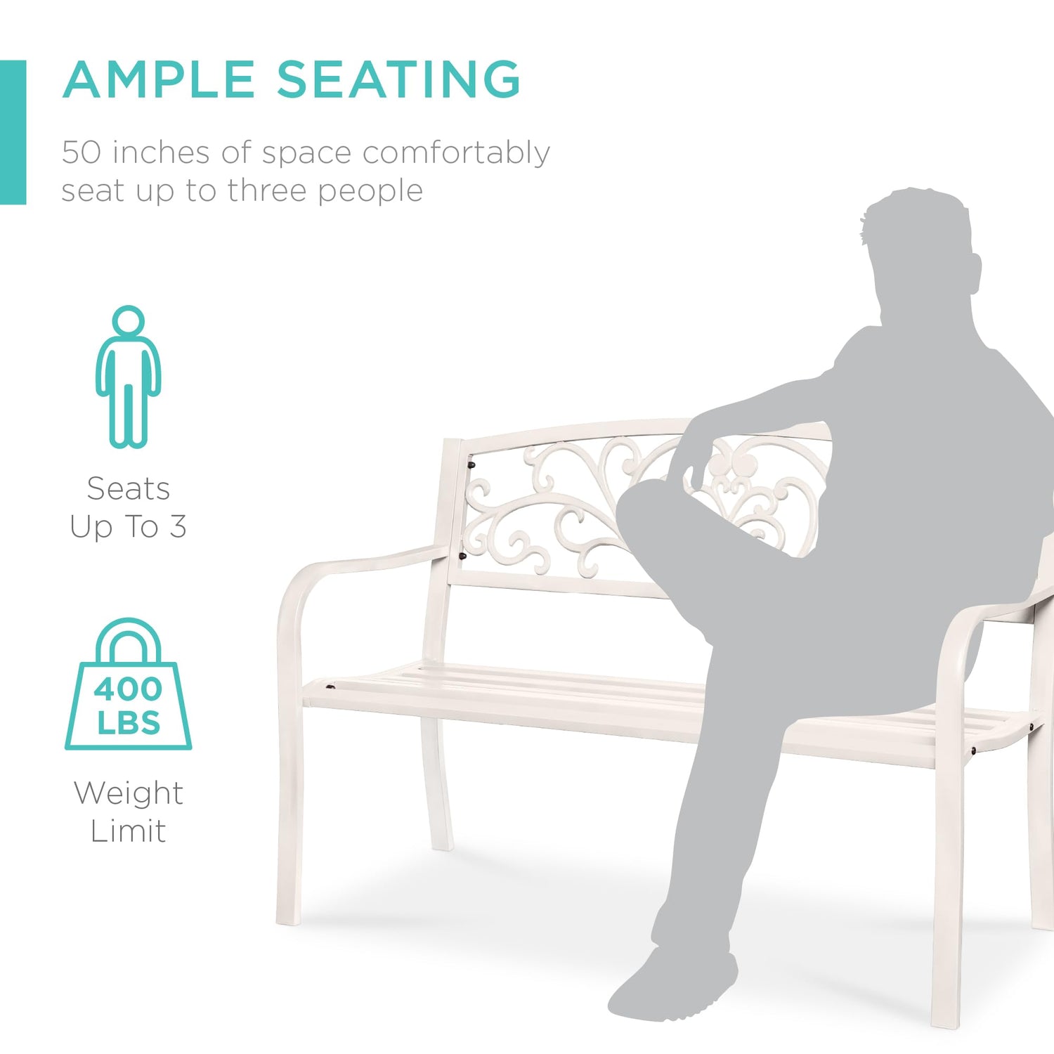 Best Choice Products Outdoor Bench Steel Garden Patio Porch Furniture for Lawn, Park, Deck w/Floral Design Backrest, Slatted Seat - White