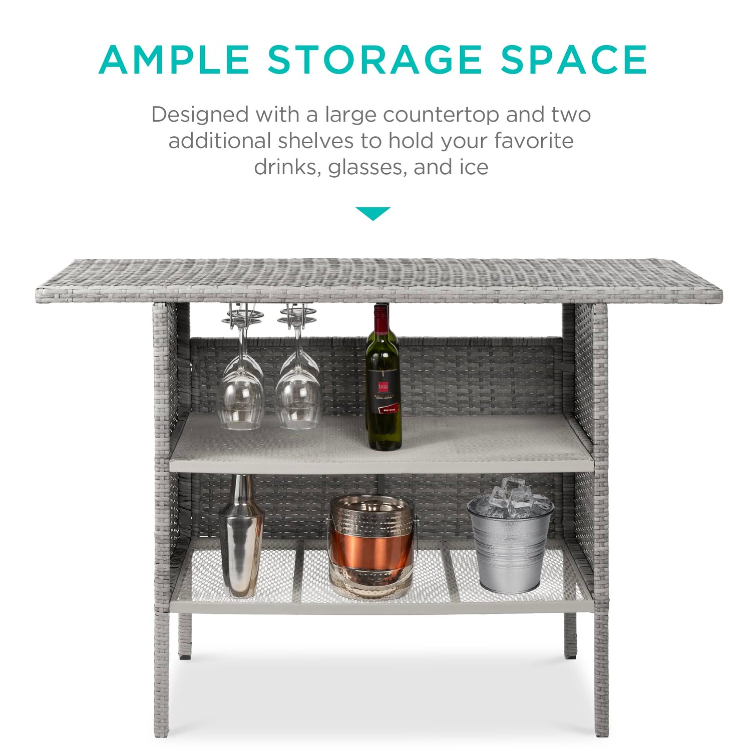 Best Choice Products Outdoor Patio Wicker Bar Counter Table Backyard Furniture w/ 2 Steel Shelves and 2 Sets of Rails - Gray