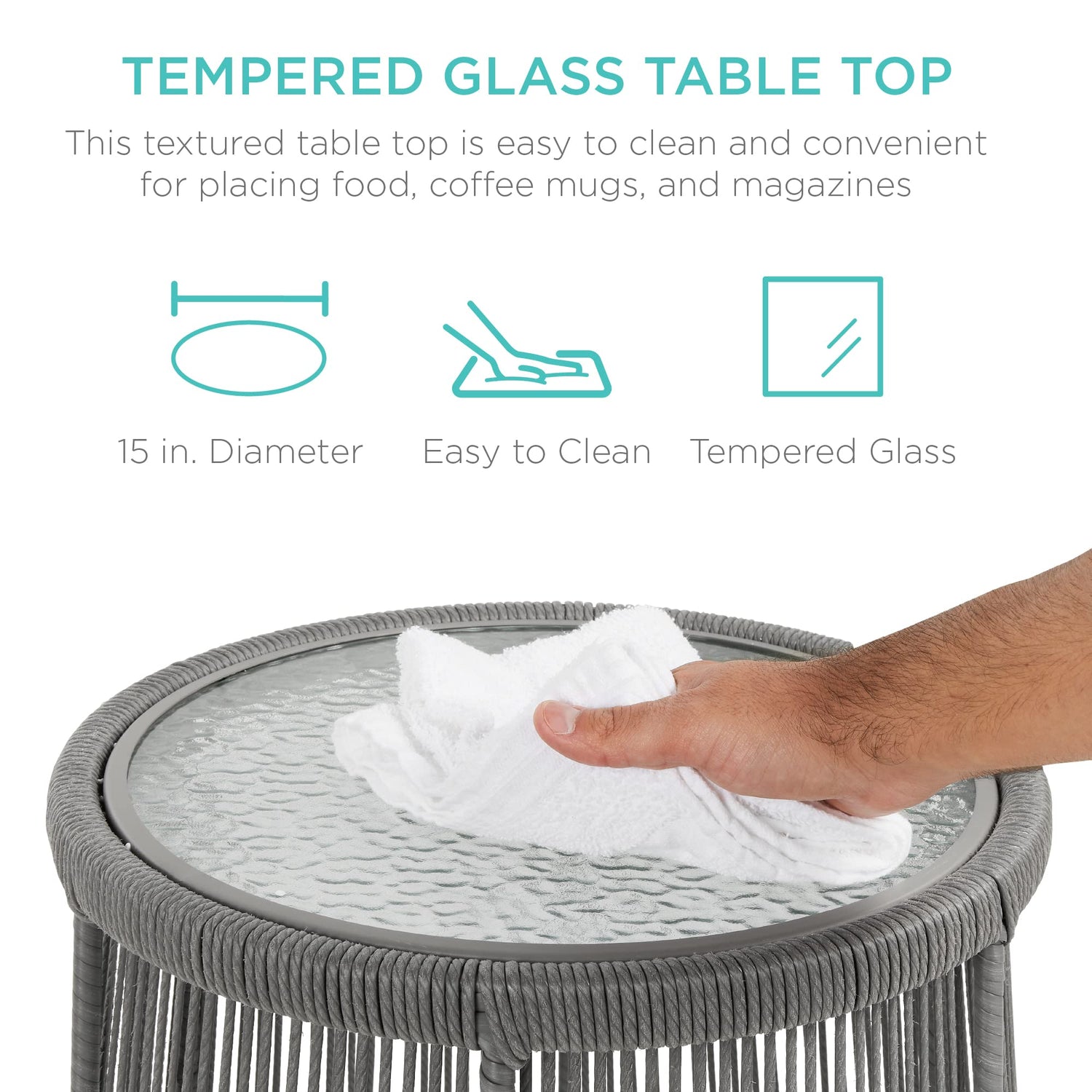 - TEMPERED GLASS TABLE TOP: Elegant matching side table included with a tempered top for easy cleaning so you can set down your plate or coffee mug without staining