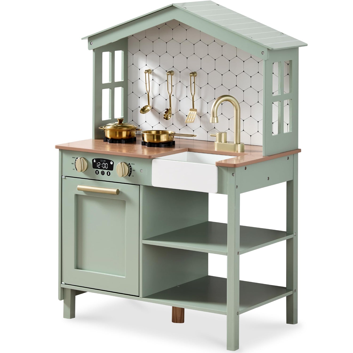 - CLASSIC FARMHOUSE DESIGN: This playset features custom 4-paned windows, a pretend stovetop, and a spacious oven with realistic clicking knobs, to provide an immersive and stylish cooking experience