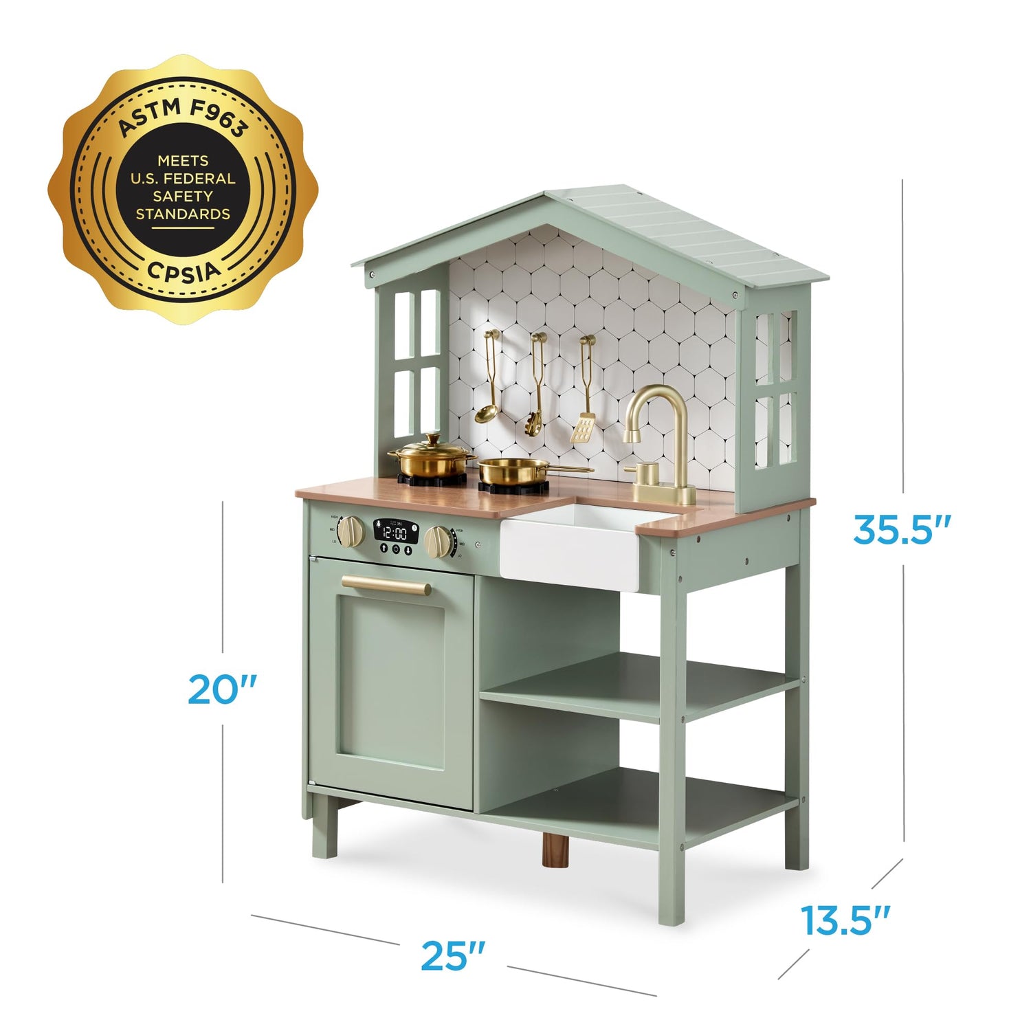 - CERTIFIED & SAFE: ASTM & CPSIA-certified materials make this playset reliable and fun option for playtime using play-friendly material such as engineered wood with metal components for lasting durability.; OVERALL DIMENSIONS: 25"(L) x 13.5"(W) x 35.5"(H)