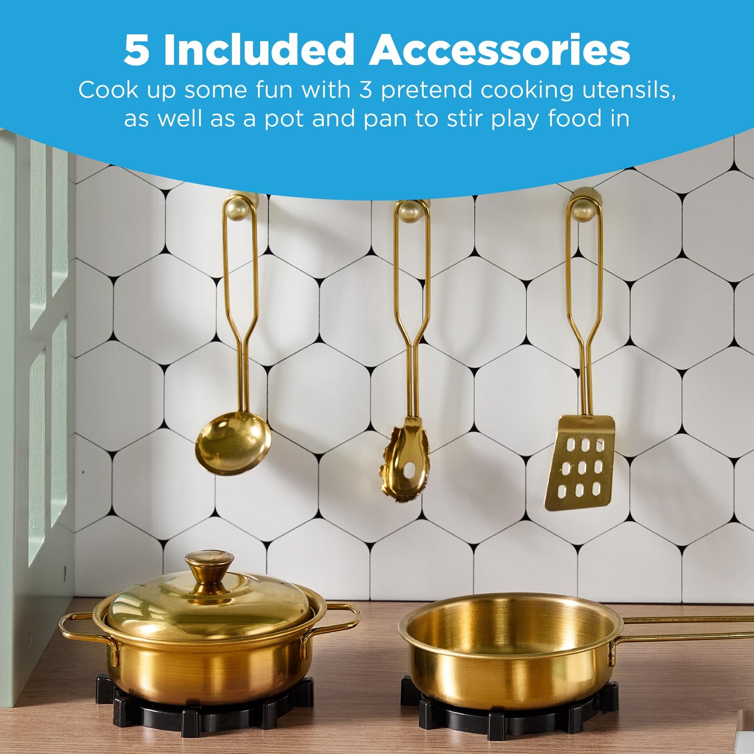 - 5 ACCESSORIES INCLUDED: Spark creativity with 3 pretend cooking utensils, plus a pot and pan for stirring up imaginative play meals