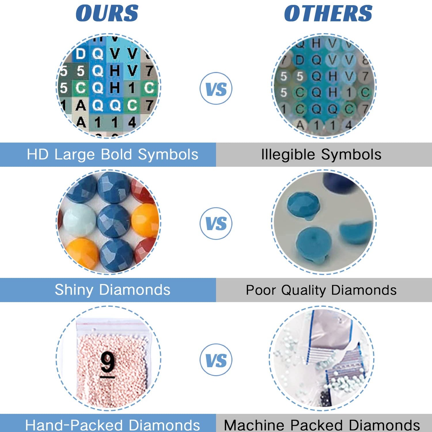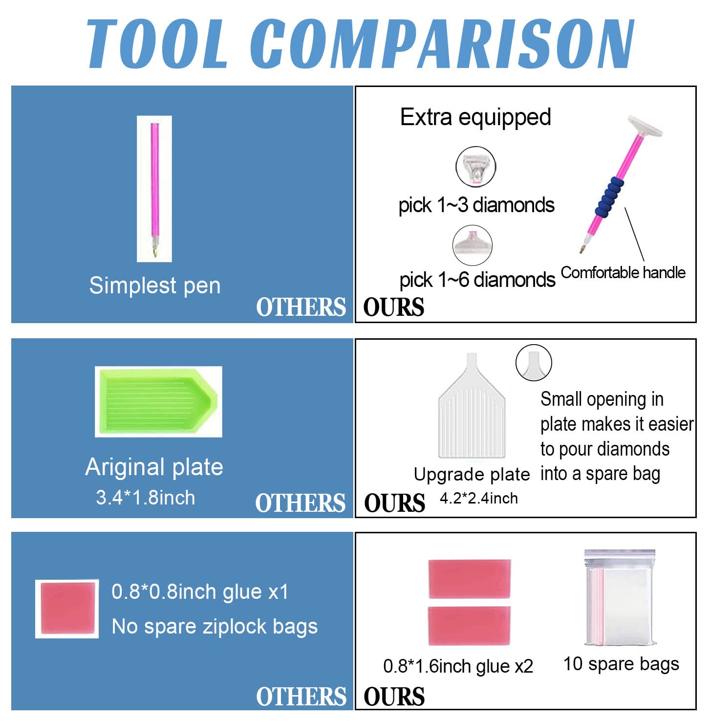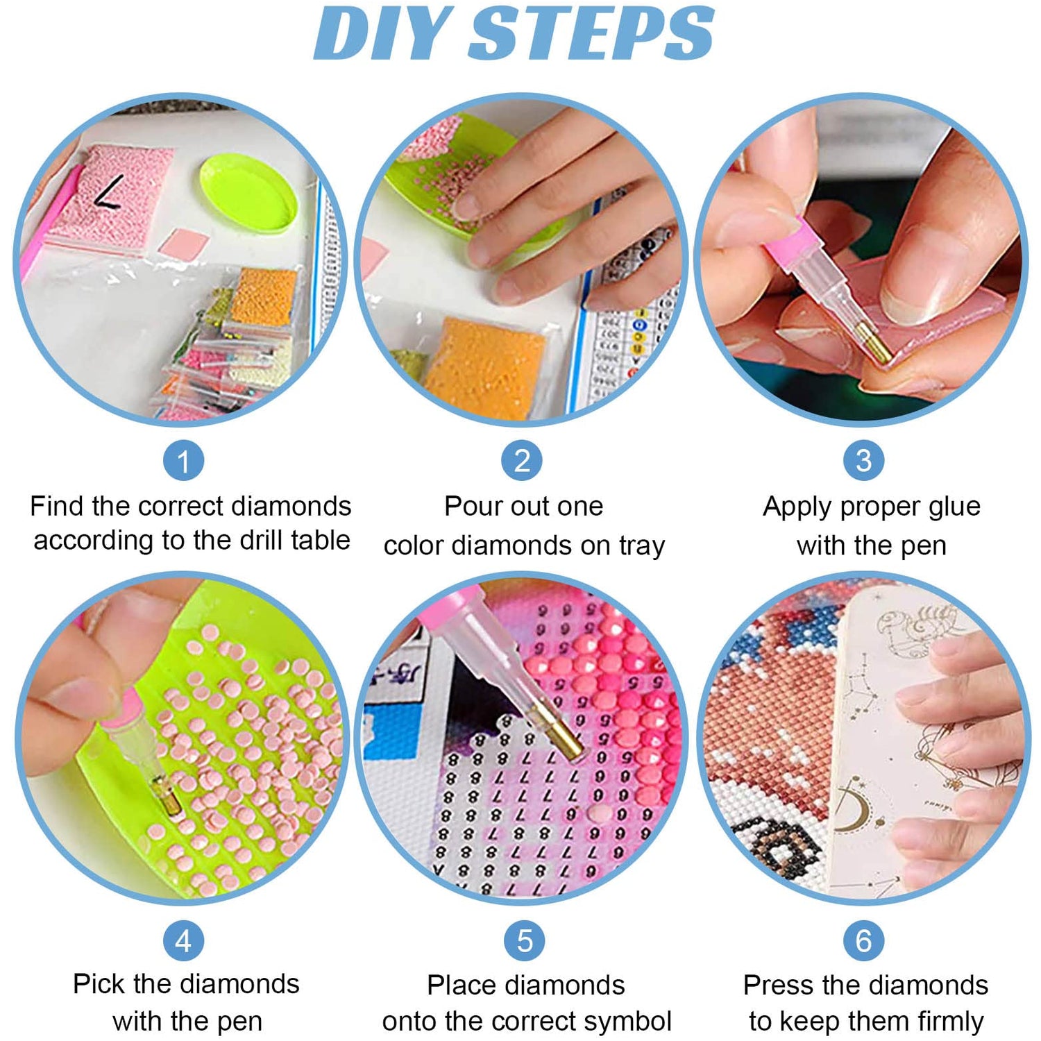 - PACKAGE CONTENTS:1*HD print canvas,1*pen,1* 3-drill pen tip,2*glue, 1*enlarged plate,10*spare ziplock bags and sufficient number of round diamonds.