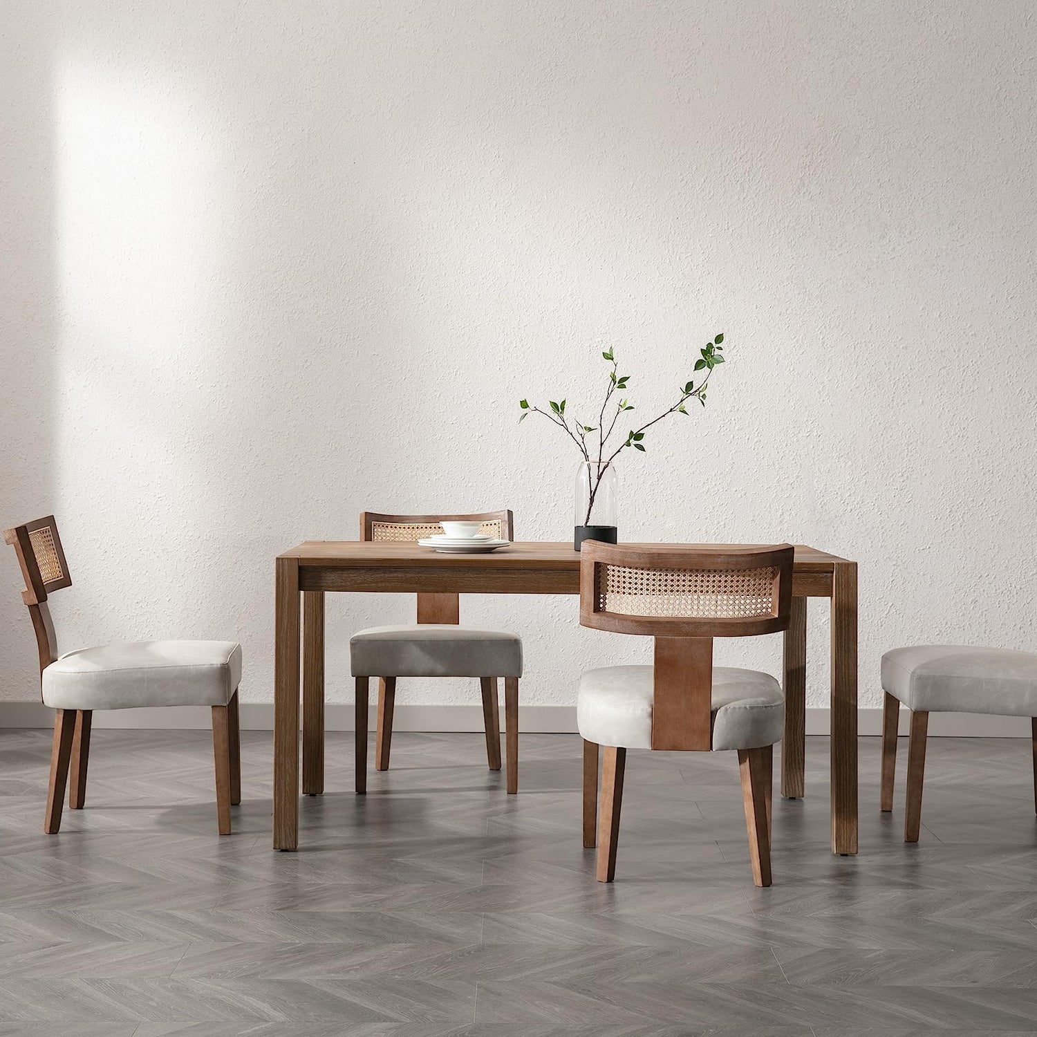 BESTANO Rattan Farmhouse Dining Chair Set of 4, Faux Leather Upholstered Cane Dining Chair with Curved Backrest and Natural Wood Legs, Mid Century Modern Dining Chairs Armless Side Chair, Grey