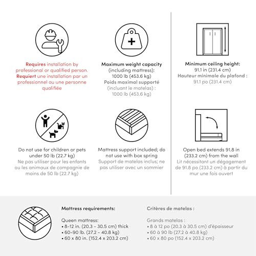 - PRACTICAL WALL BED: The dual-mount wall bed mechanism attaches to both the floor and wall for ease of assembly and maximum stability and durability. The queen size Murphy bed accommodates most standard queen mattresses (8-12 inches thick, 60-90 lb, 60 x 80 inches, no futons) to let you choose the most comfortable option (mattress not included, do not use with box spring).