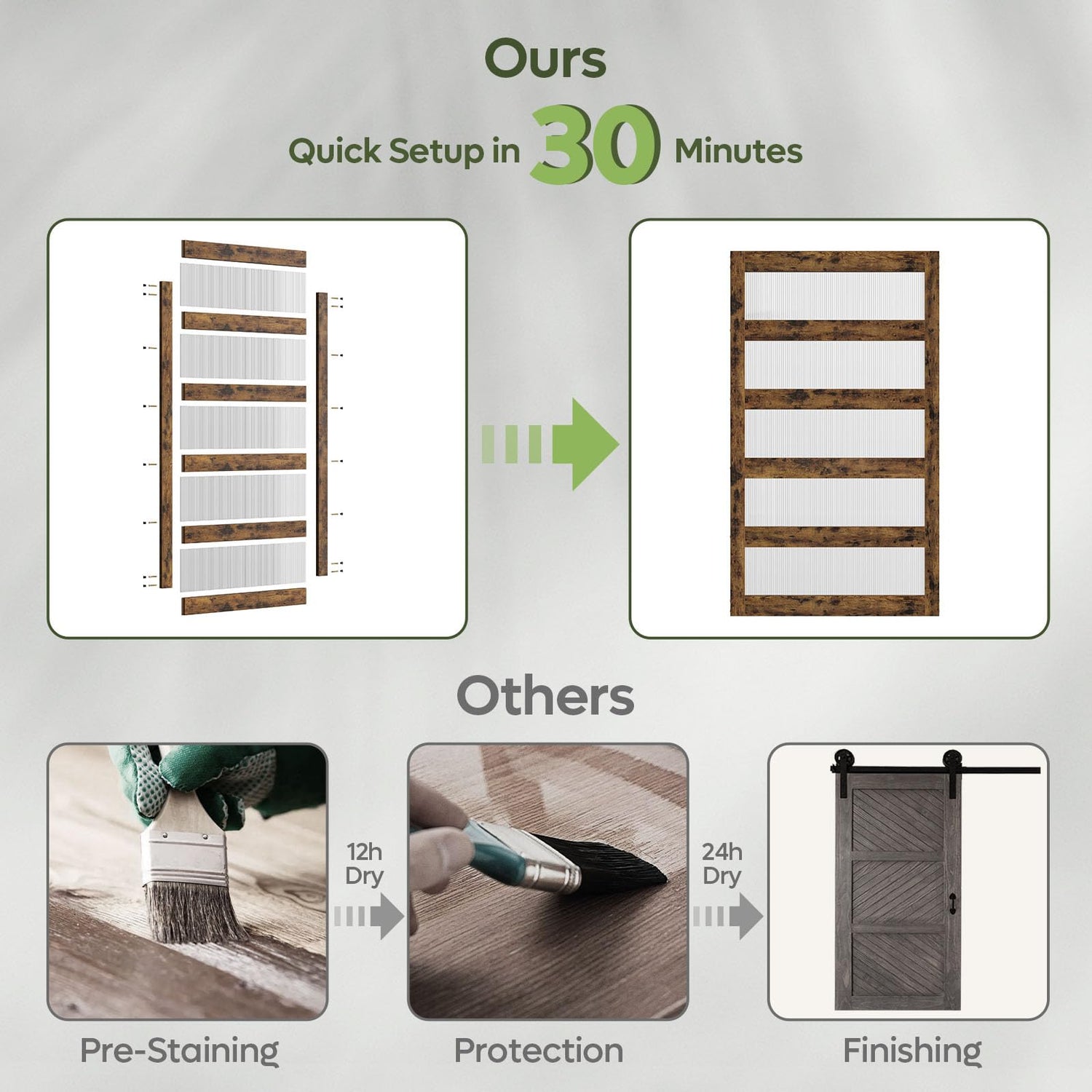 - Simplified Assembly & Pre-finished PVC Surfaces: The glass barn doors have pre-drilled holes for hooks and handles. Each door comes with a separate door handle, lock, glass and hardware kit for easy assembly.Pre-finished PVC surfaces offer waterproof protection and smooth surface that is not only easy to clean, but also enhances the protection of the door surface, making it particularly suitable for homes with pets.