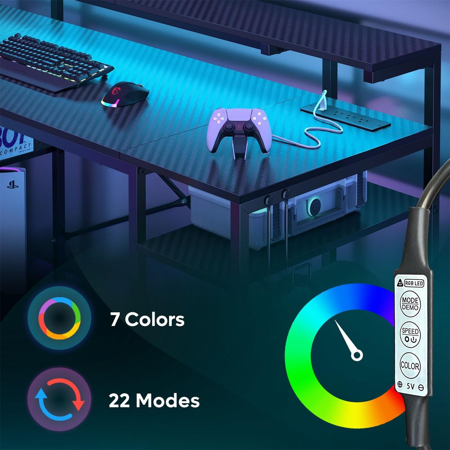 - 【Gaming Desk with LED Lights】This gamer desk with LED lights offers 7 different colors and 22 dynamic effects, all of which can be easily adjusted with the buttons on the light. It creates different lighting effects and atmospheres to personalize your gaming space and add dynamics to your leisure time.