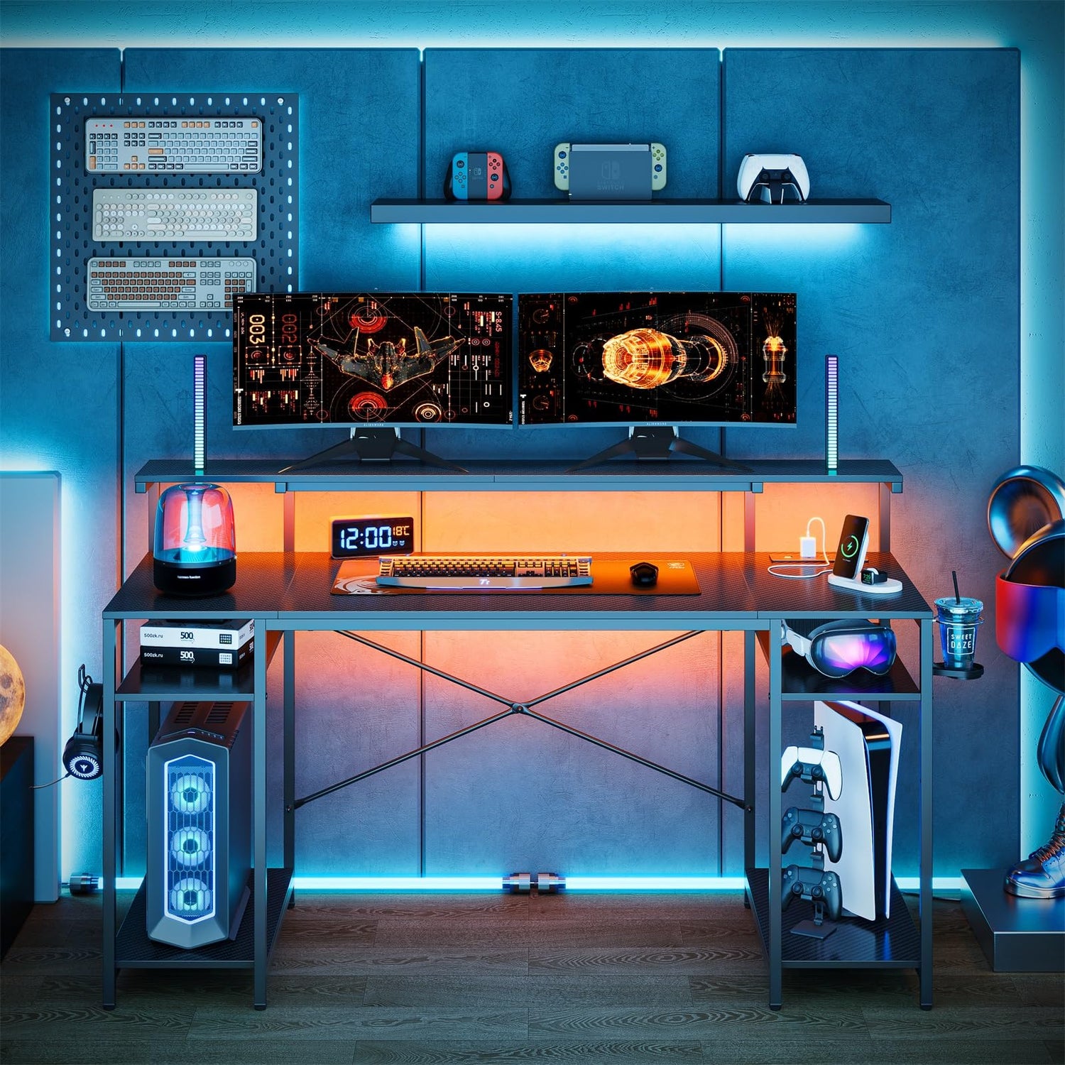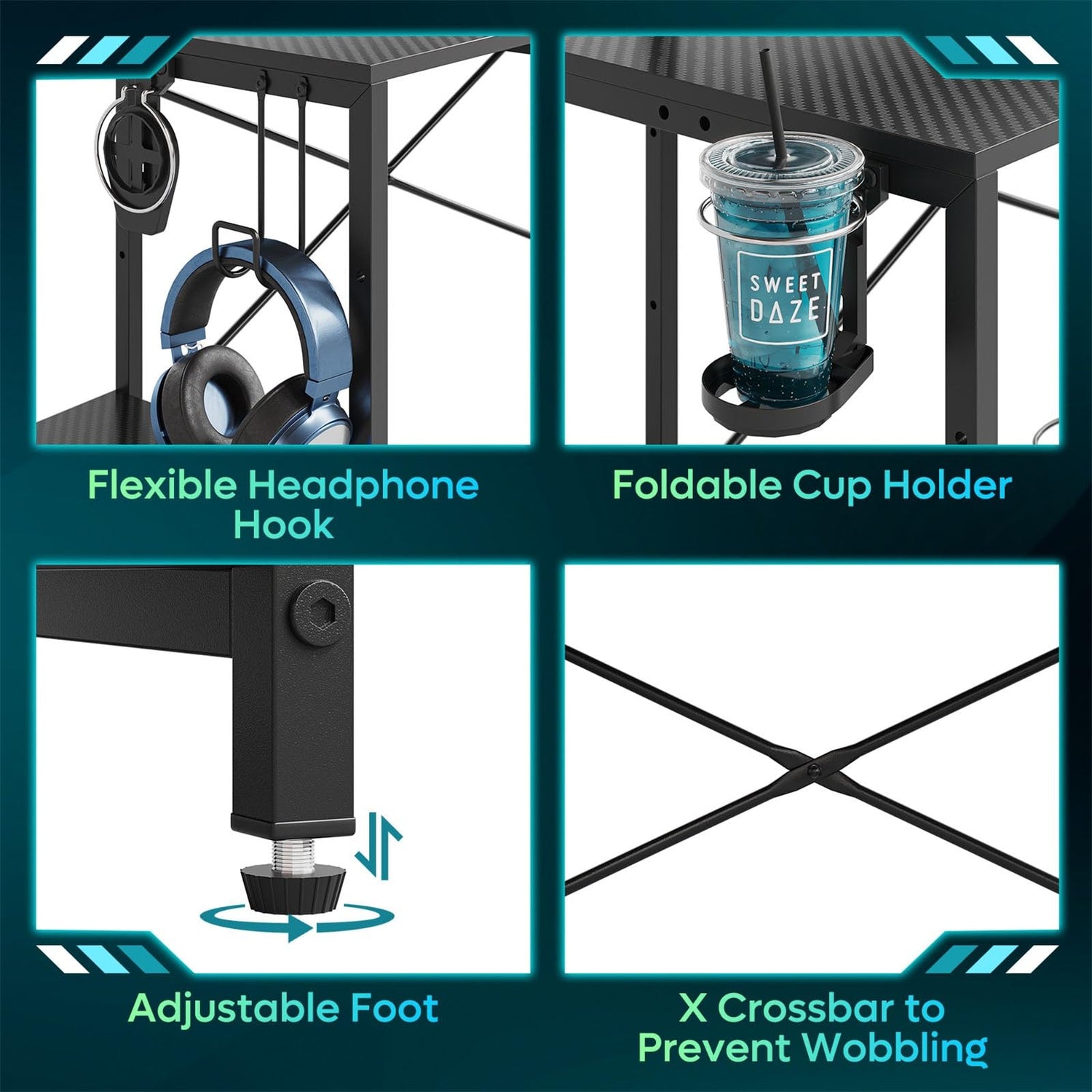 - 【Flexible Storage Space】This desk with shelves comes with 2 adjustable height shelves, left and right interchangeable foldable cup holder and headphone hook. The shelf on both sides can be adjusted to 3 different heights, allowing you to place your CPU, low file basket, PS5, gaming devices, etc, saving space on your desktop and providing you with a comfortable environment for gaming or working.