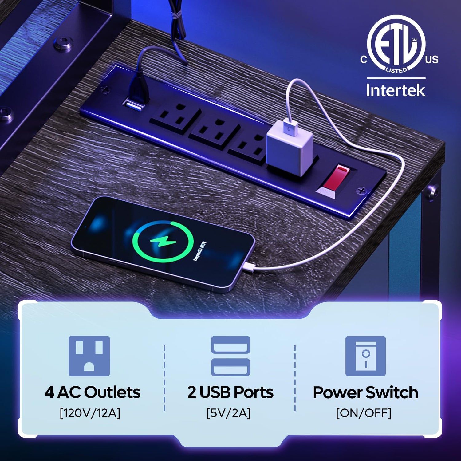 - Gaming Desk with Power Outlets - This computer desk has built-in 4 AC outlets and 2 USB ports your phone, tablet, laptop and other electronic devices. ETL-certified charging station with an on/off switch for convenience and safety