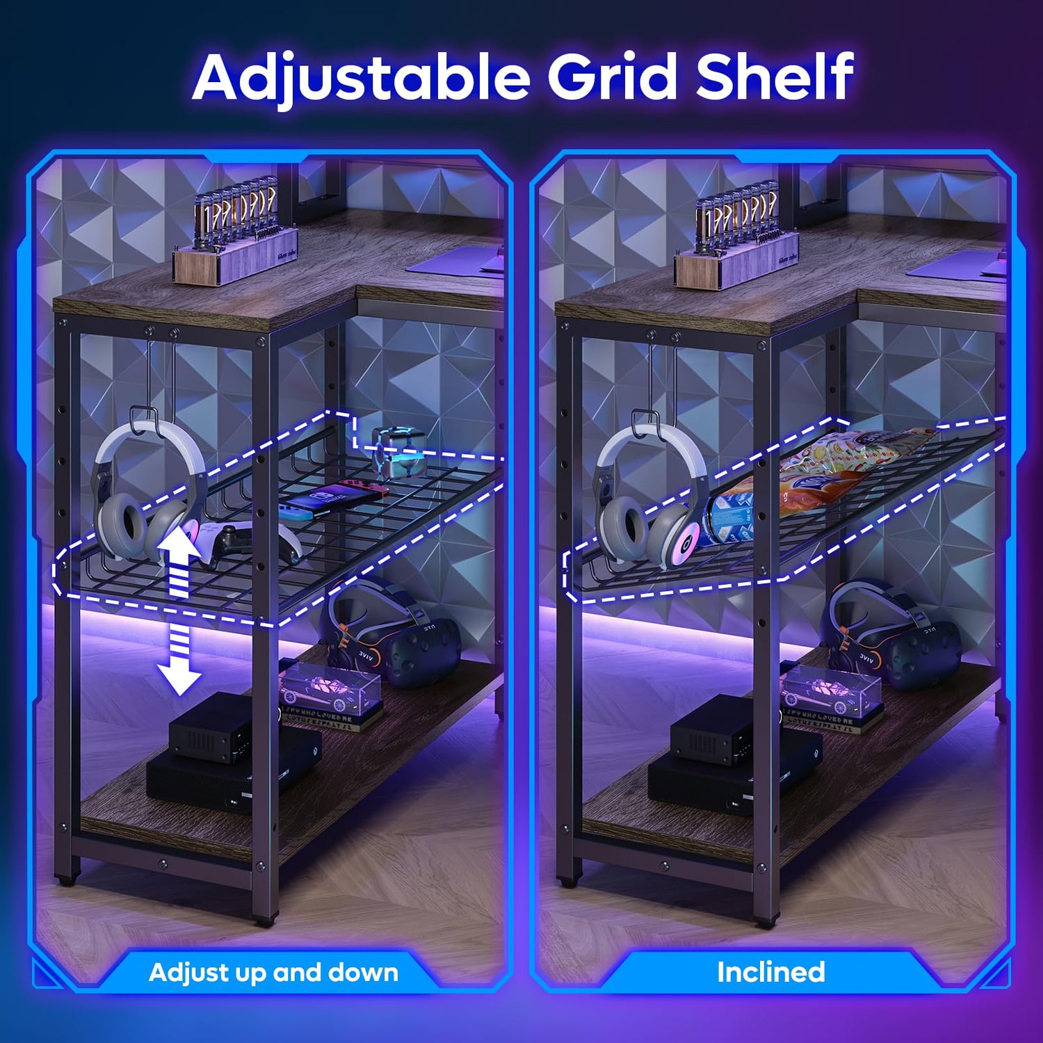 - Large Workstation - This corner desk comes with a 19.3" x 19.7" open tier shelf that can accommodate large devices such as printers and PS5. There is also an adjustable metal shelf that adjusts to 3 different heights and tilts to your preferred angle. Whether you're gaming or working, this desk has you covered.