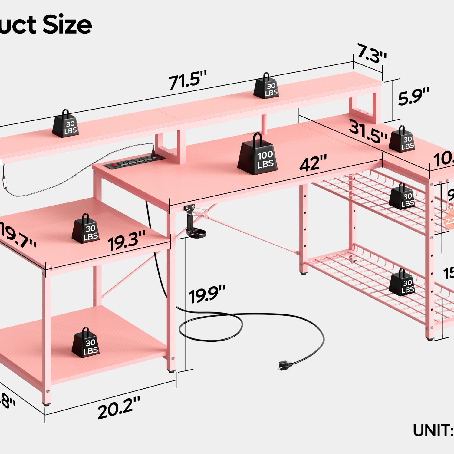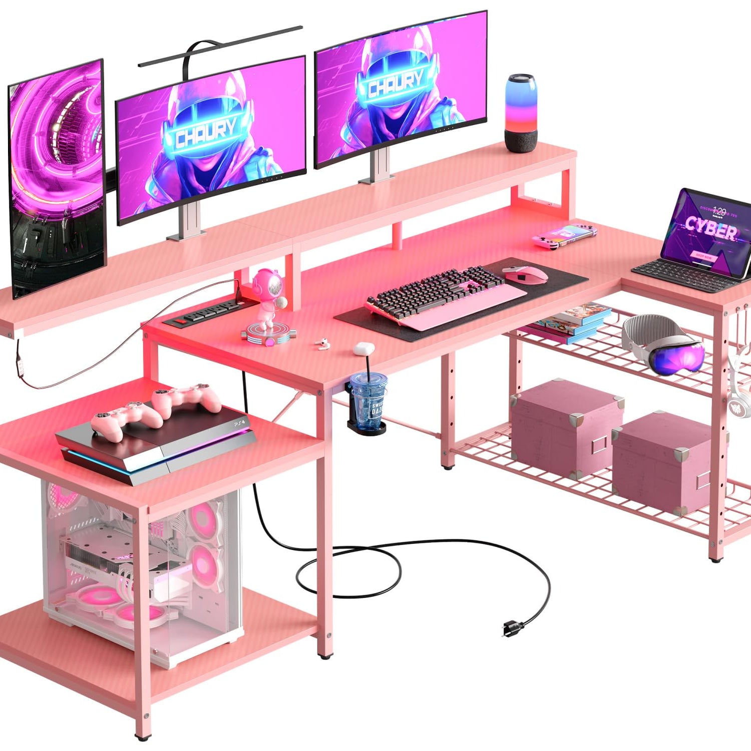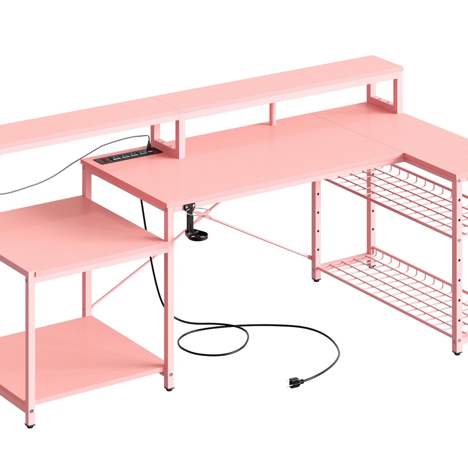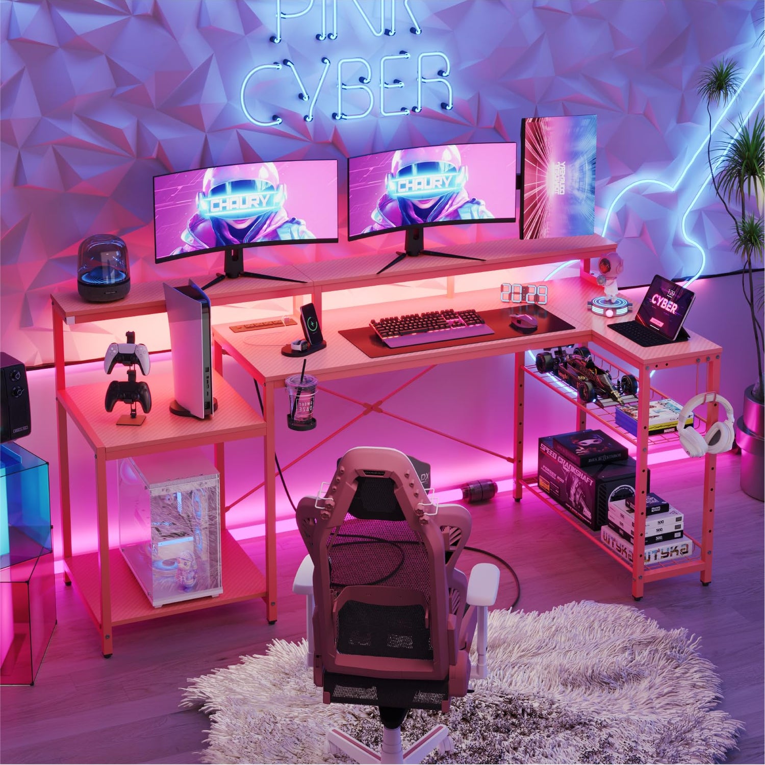 Bestier 71.5 inch Gaming Desk with Power Outlet, Large LED Computer Desk with Monitor Stand, L Shaped Desk with Storage Shelf, Cup Holder & Headset Hooks, Corner Gamer Desk for Bedroom Pink