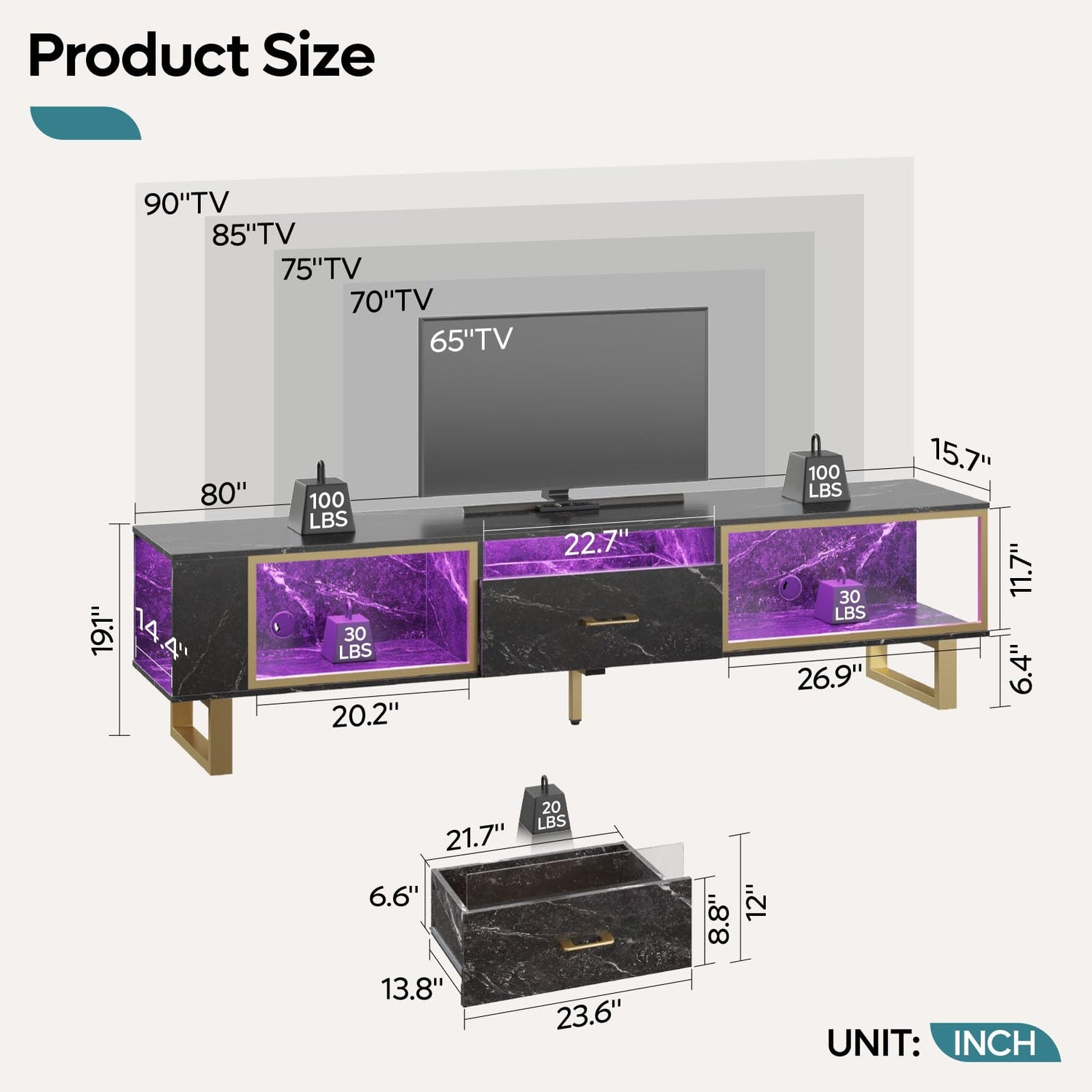 - 【Remote Control LED TV Stand】This tv stand with led lights feature remote control 7-color LED lights and 22 dynamic modes to easily customize your favorite lighting mood and immerse you in an immersive movie watching or gaming experience,making the room show different styles of charm
