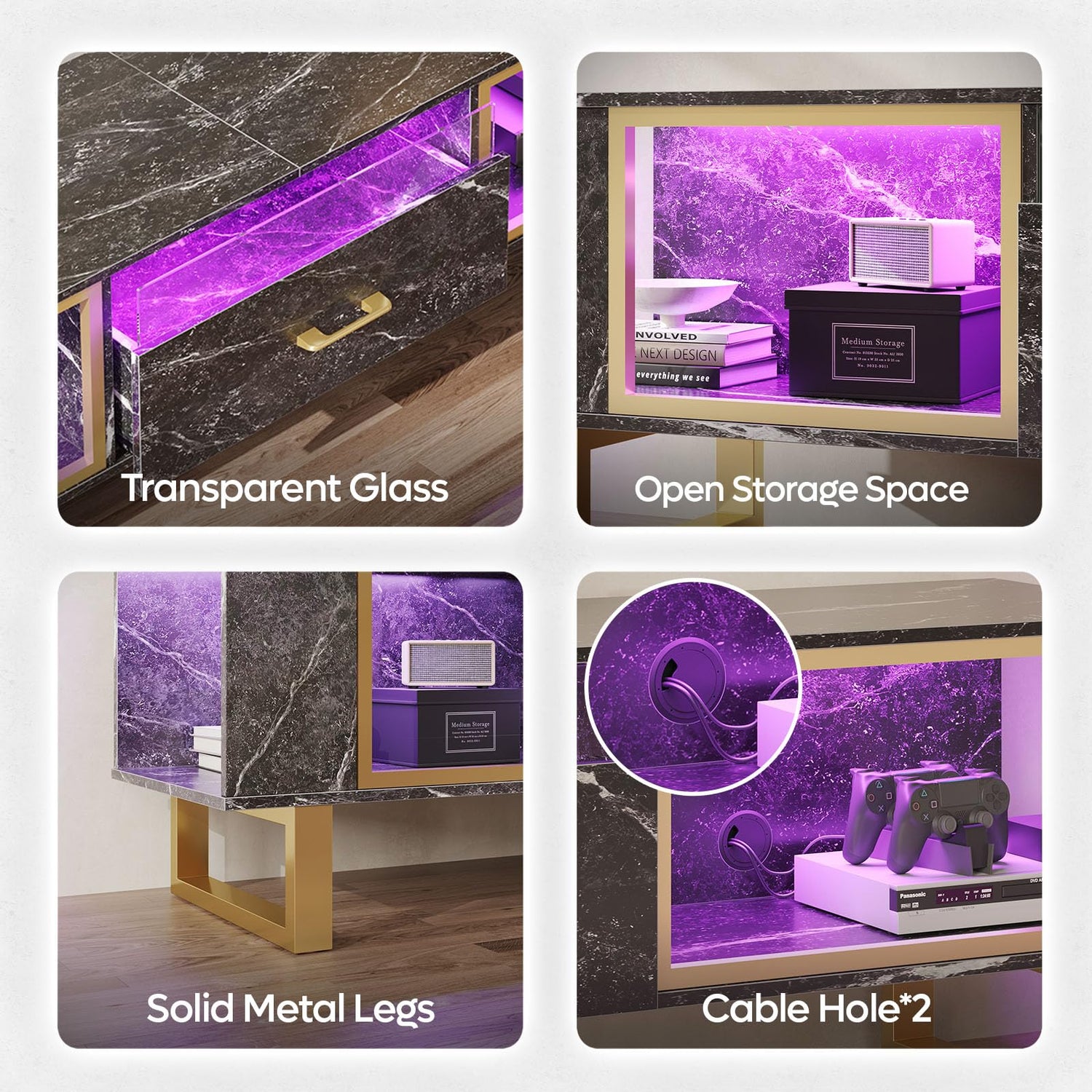 - 【Half-Glass Drawer Design】The drawer features a unique glass inlay with a transparent glass that can reflect different RGB lights, adding a unique design aesthetic and atmosphere to the entire black tv stand. Cool transparent lighting will make your fun life more vibrant