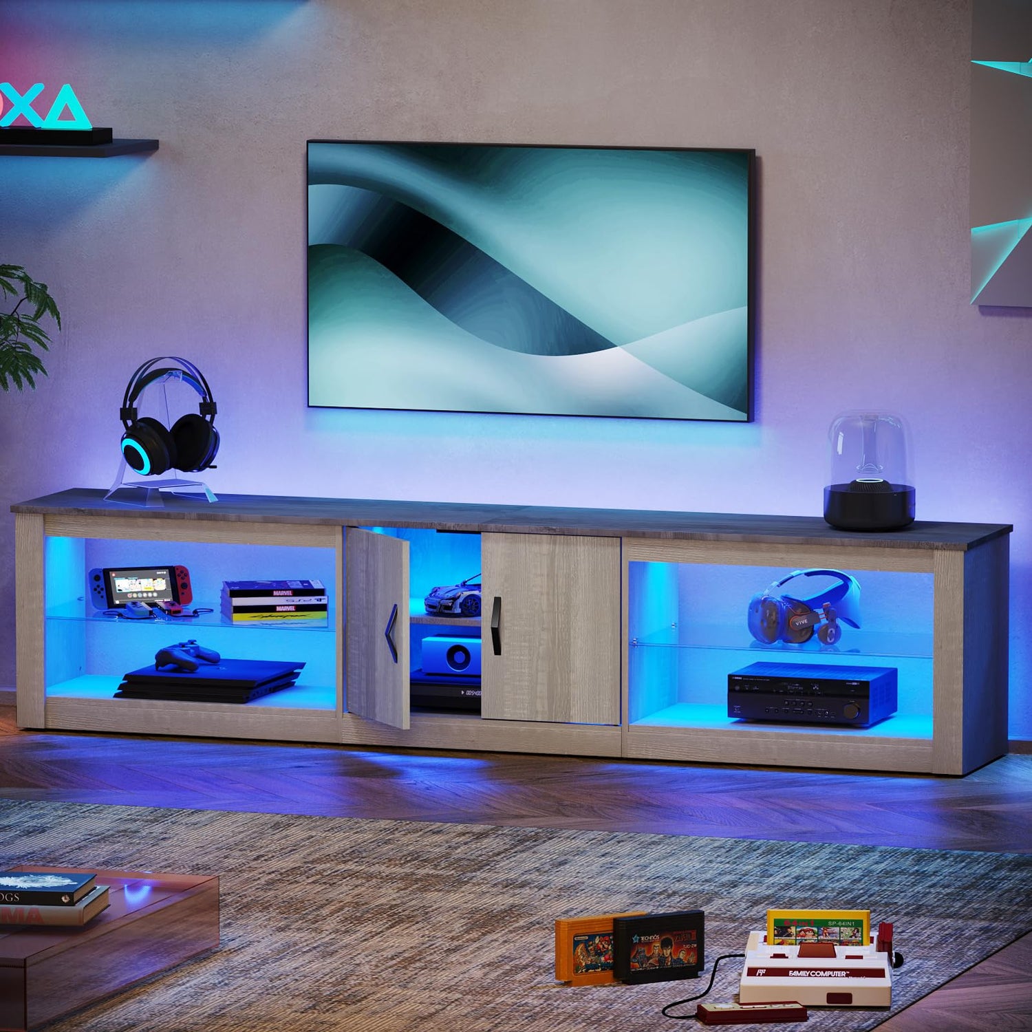 - 【Adjustable Glass Shelves】With its user-friendly and functional design,our led media console features 4 open glass shelves on both sides, which can be easily adjusted to 3 different heights, providing ample space to display your gaming gear, Xbox, remote controls or books, and adding a modern touch to your home decor.