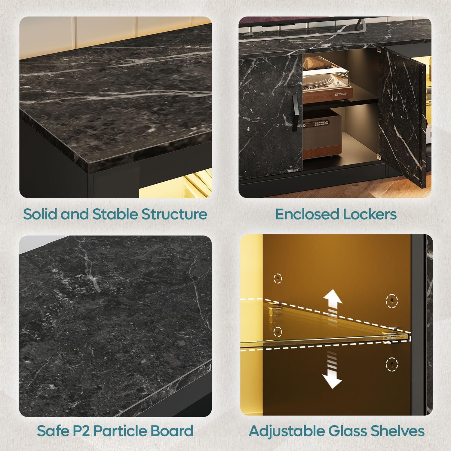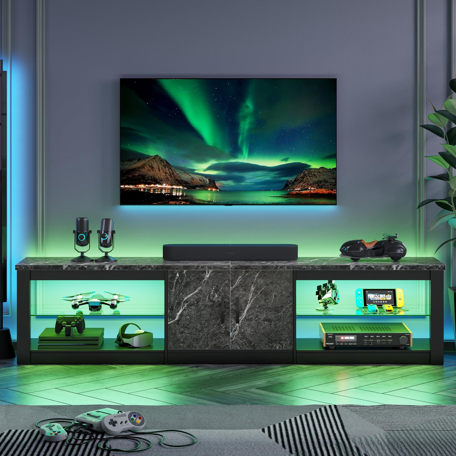 Bestier 80 Inch TV Stand for 75/85/86 inch TVs, LED Gaming Entertainment Center for PS5 with Storage Cabinet &Adjustable Glass Shelves, Modern TV Console Table for Living Room Bedroom, Black Marble