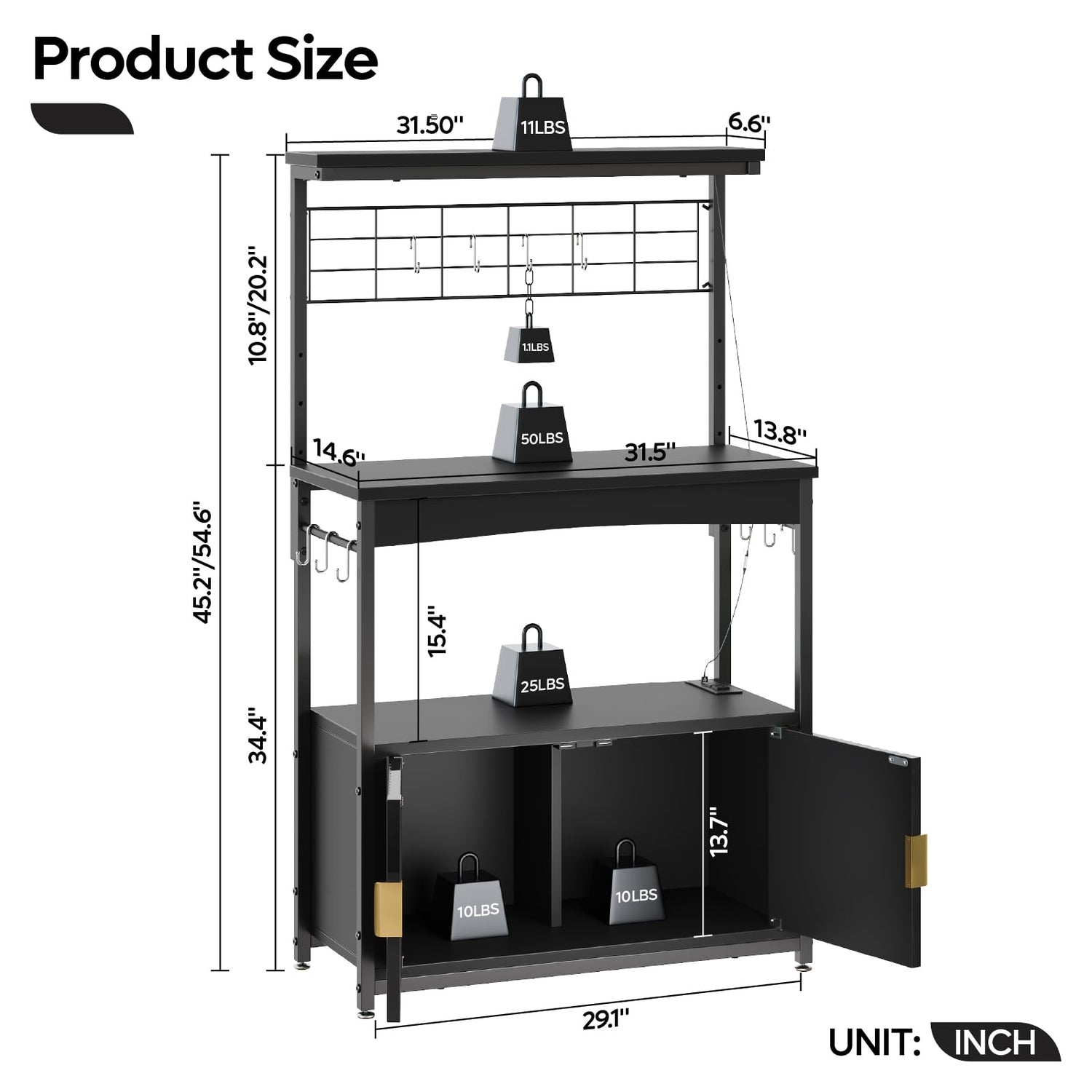 - Adjustable Height & Foot Pads: This bakers rack with storage measures 31.5" wide x 14.57" deep, height adjustable from 45.2" to 54.6"; Adjustable foot pads allow placement on uneven floors.