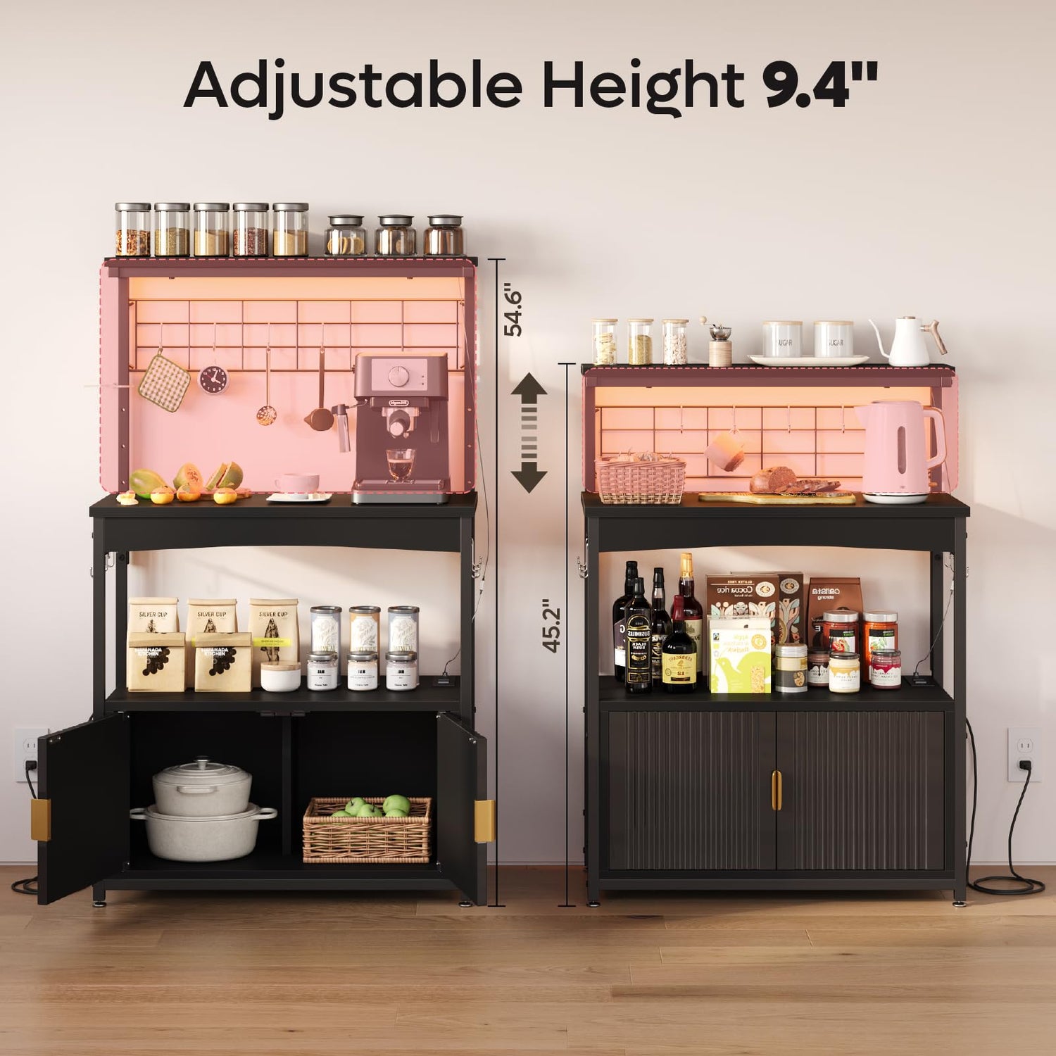 - Microwave Stand with LED Lights: This coffee bar cabinet has a fluted design on the doors with gold handles for a modern and elegant look; Equipped with LED lights adjustable to 7 colors, providing illumination and enhancing kitchen ambiance at night.