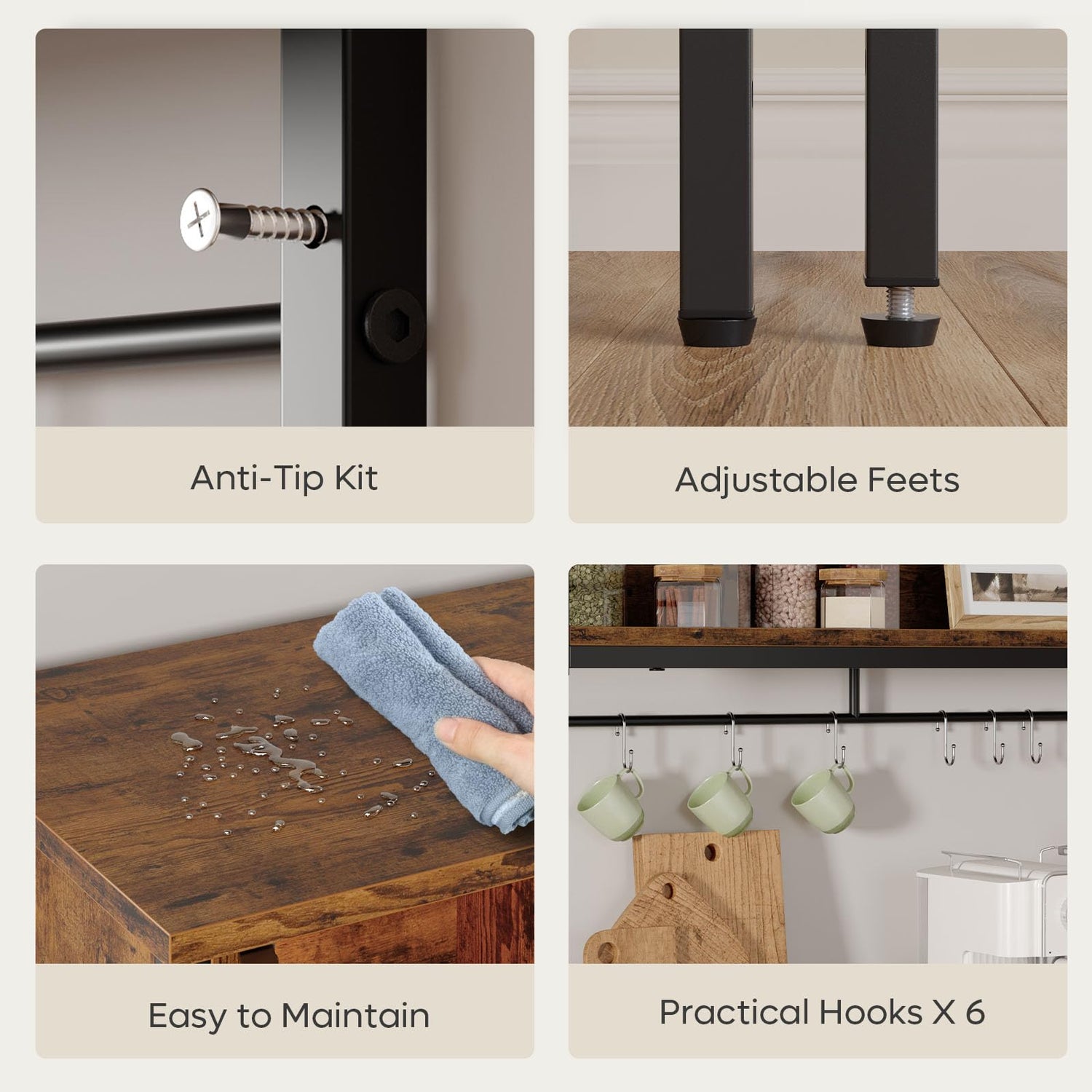 The spacious countertop of the bakers rack provides ample room for essential kitchen appliances, such as a microwave oven or coffee pot. To further streamline your cooking process, the rack includes 6 S-shaped hooks for hanging utensils, cooking spoons, and mugs, making your kitchen workflow ultra-efficient.