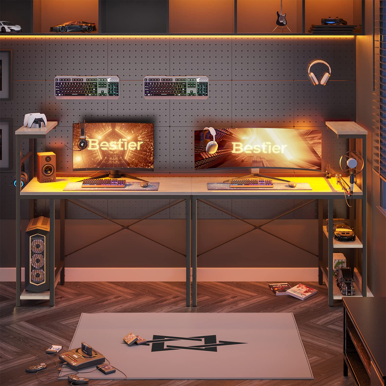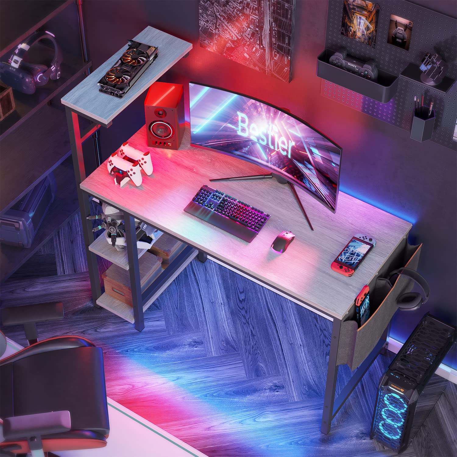Bestier Computer Desk with 4 Tiers Shelves, Gaming Desk with LED Lights, 44 Inch Office Desk with Storage Bag & Printer Shelf (Retro Grey Oak)