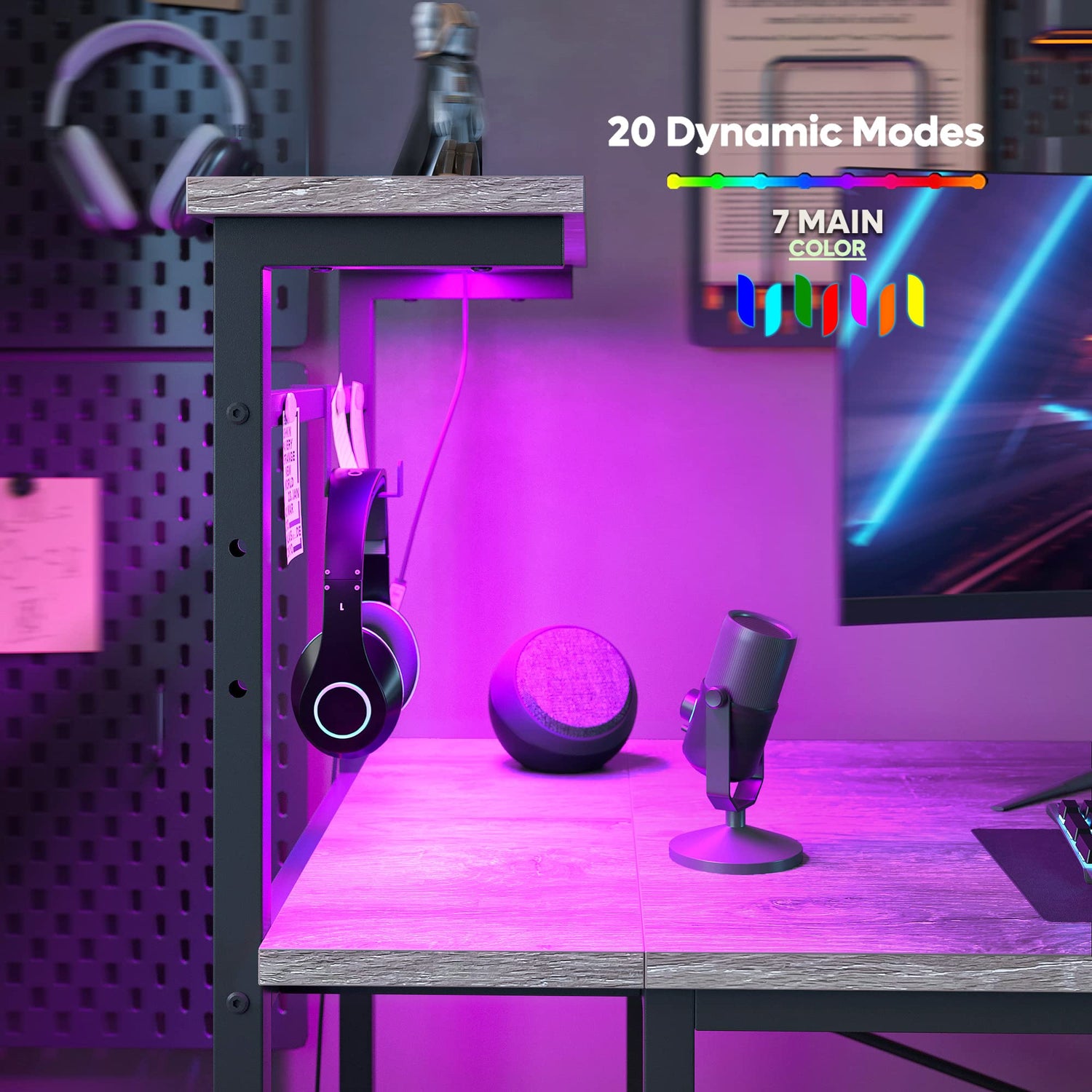 - More Special: The gaming desk offers a cool LED light, it has 7 color selections & 20 dynamic modes. The LED light creates a fun and exciting atmosphere, you will completely immerse yourself in your work and writing time. The unique gaming table will be the envy of friends and colleagues around you