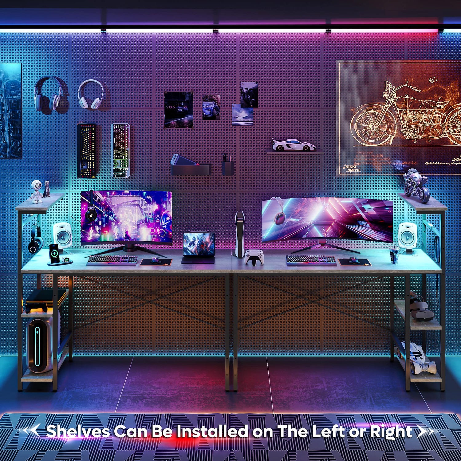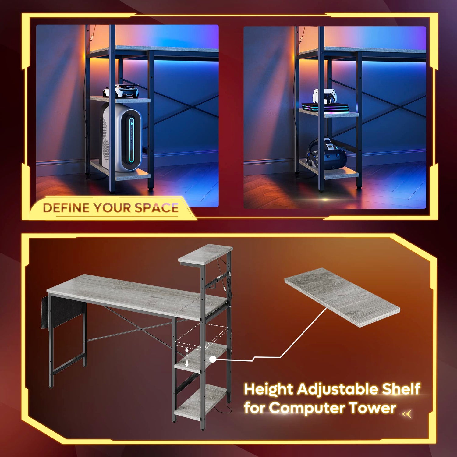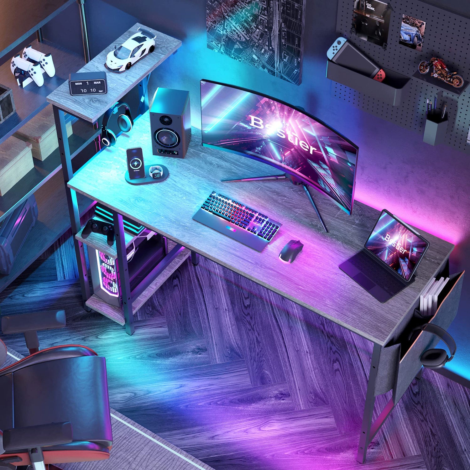 Bestier Gaming Desk with LED Lights, Computer Desk with 4 Tiers Reversible Shelves, 51.3 Inch Home Office Writing Desk with Side Storage Bag, Hooks and Height Adjustable Shelf (Retro Grey Oak)