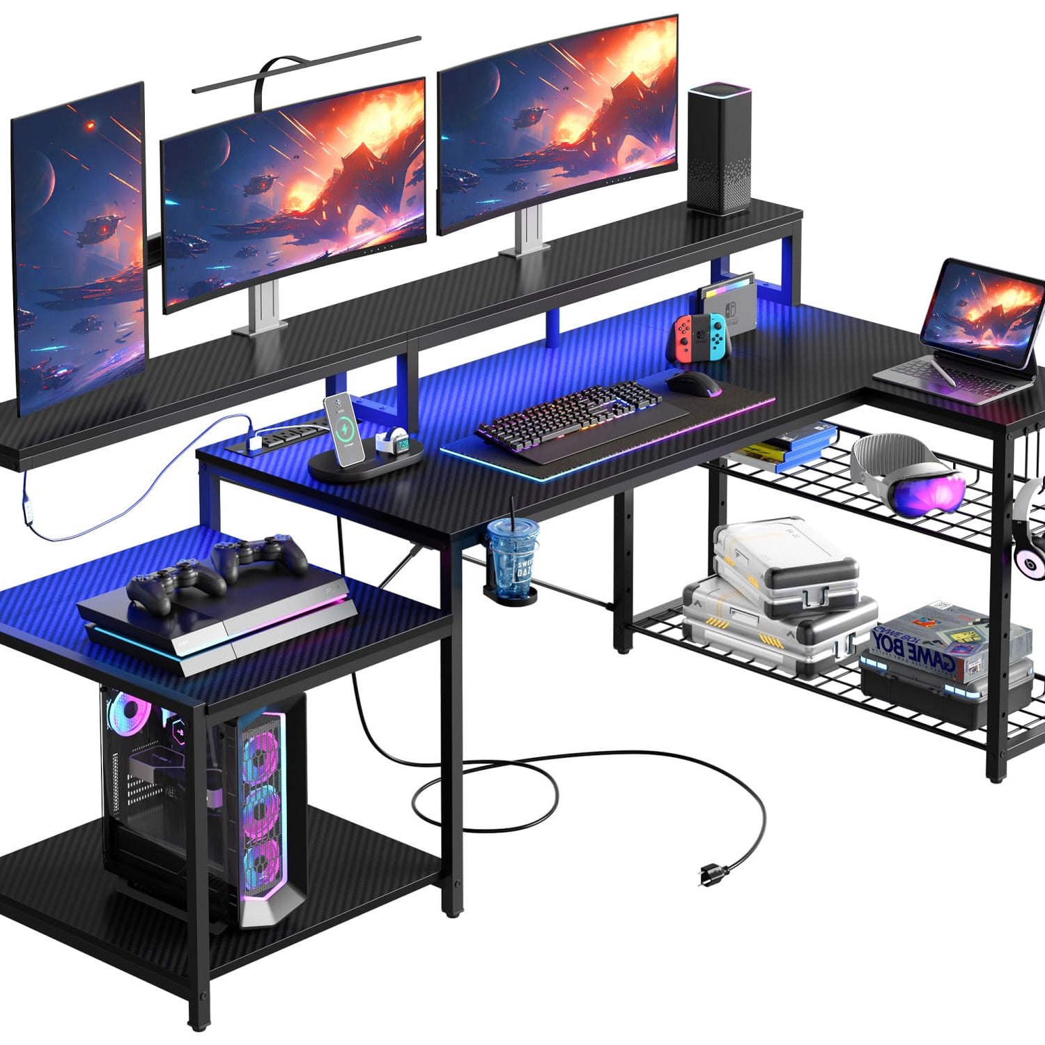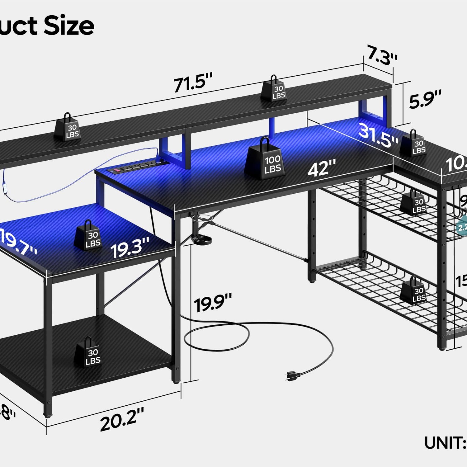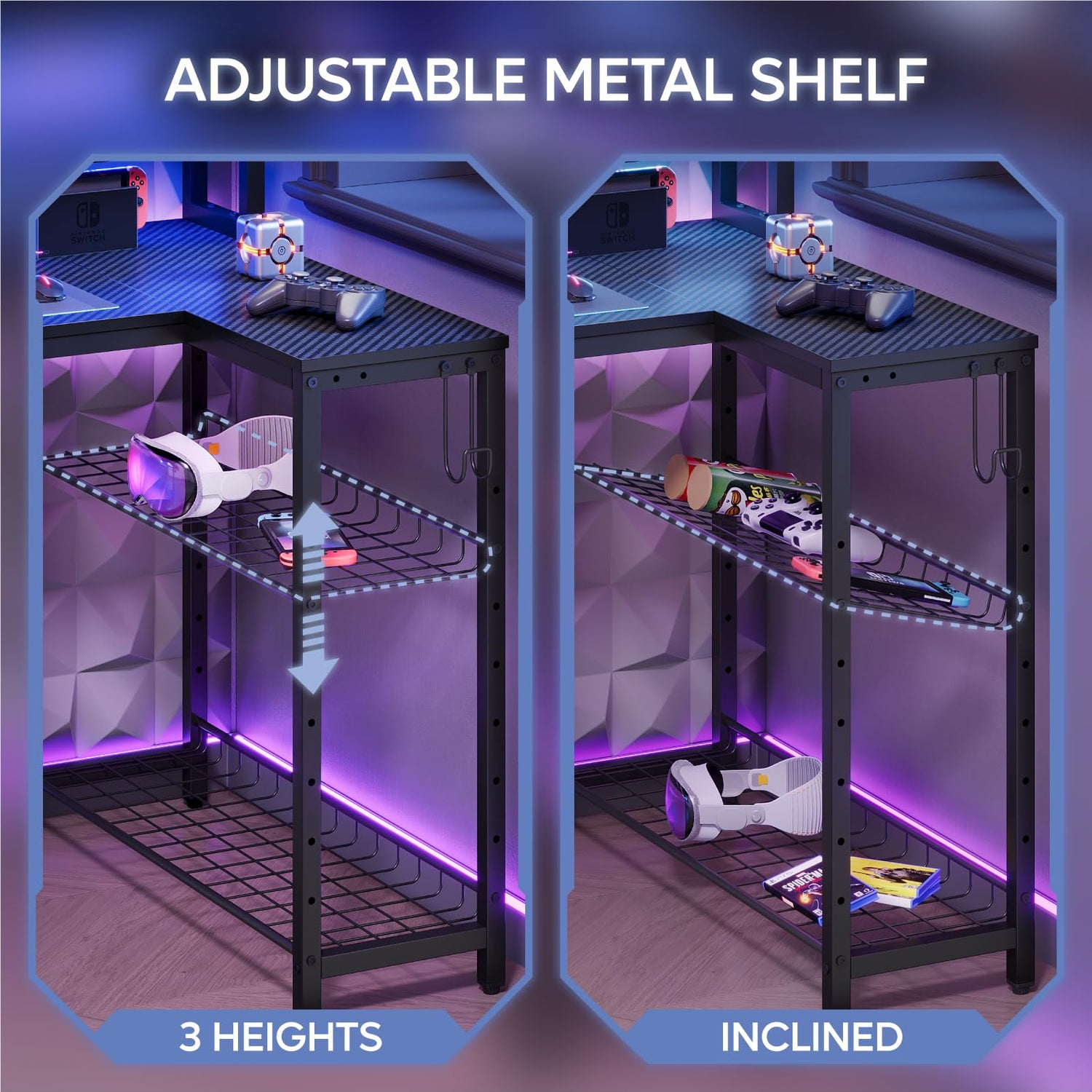 Bestier Gaming Desk with Power Outlet, 71.5 inch LED Computer Desk with Monitor Stand, L Shaped Large Desk with Metal Shelf, Cup Holder & Headset Hooks, Corner Desk for Bedroom 3D Carbon Fiber