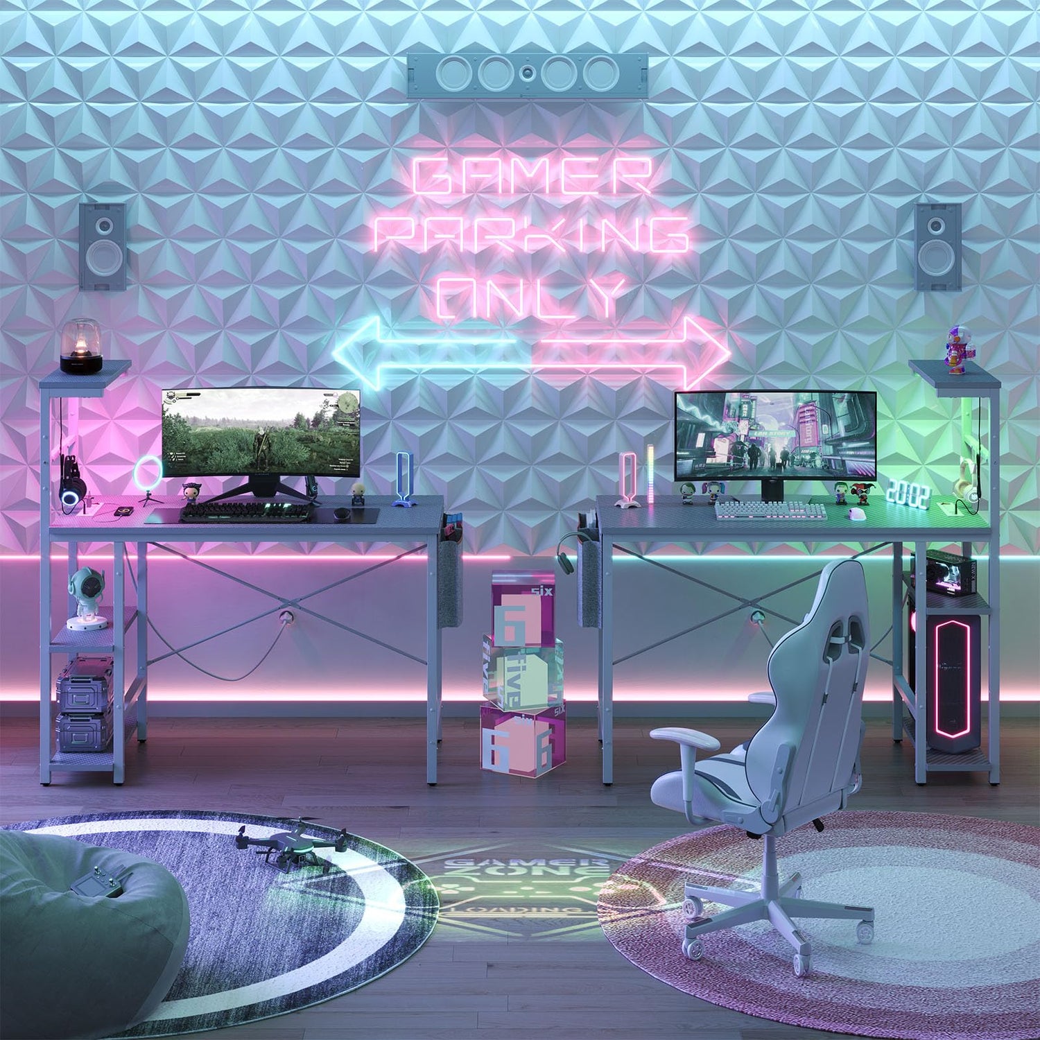 - 【Reversible Shelves & Storage Bag & Headset Hook】: The reversible shelves can be installed on the left or right side to your own personal preferences. The storage shelves provide ample storage space for your unique gaming setup and the side storage bag is perfect for storing cables or other small items, while the hook can hold accessories such as headphones, Keychain, etc