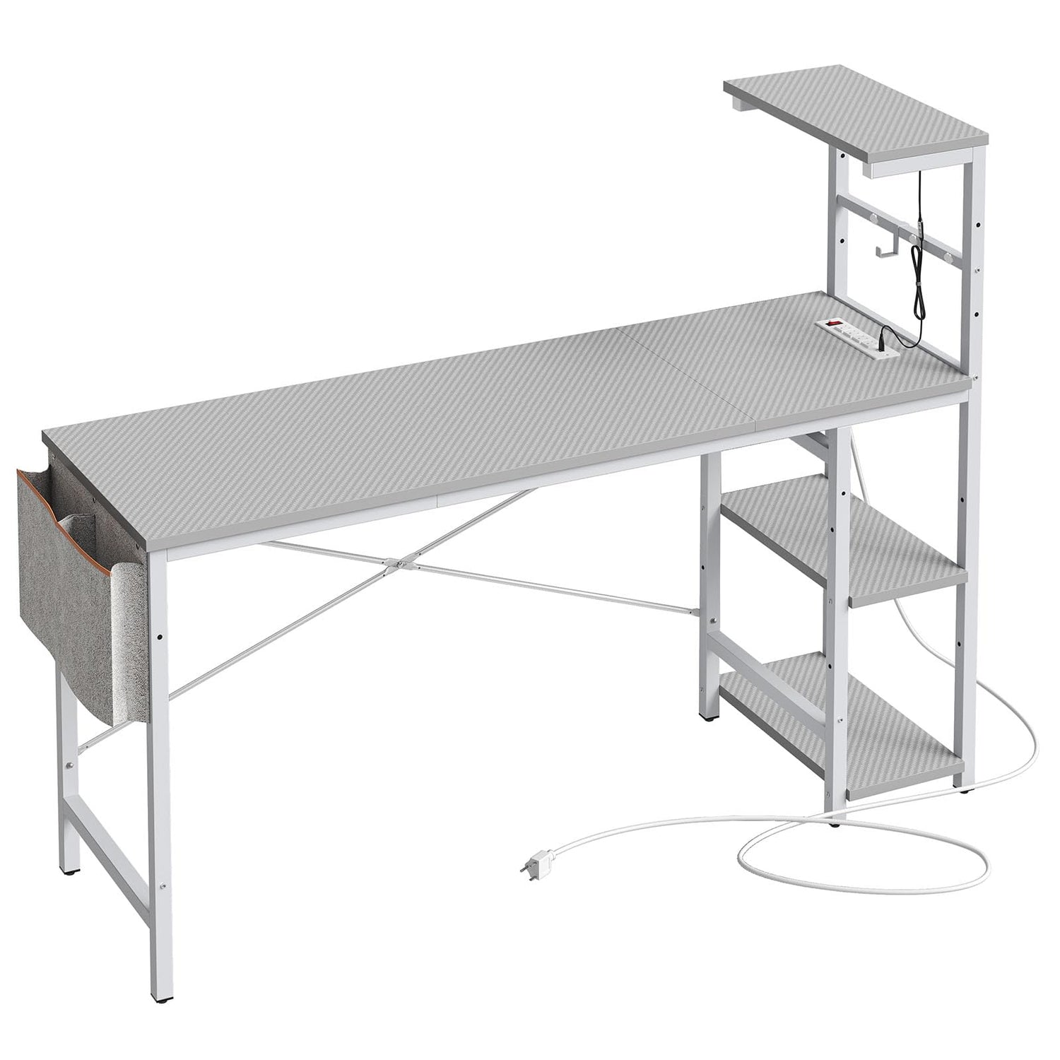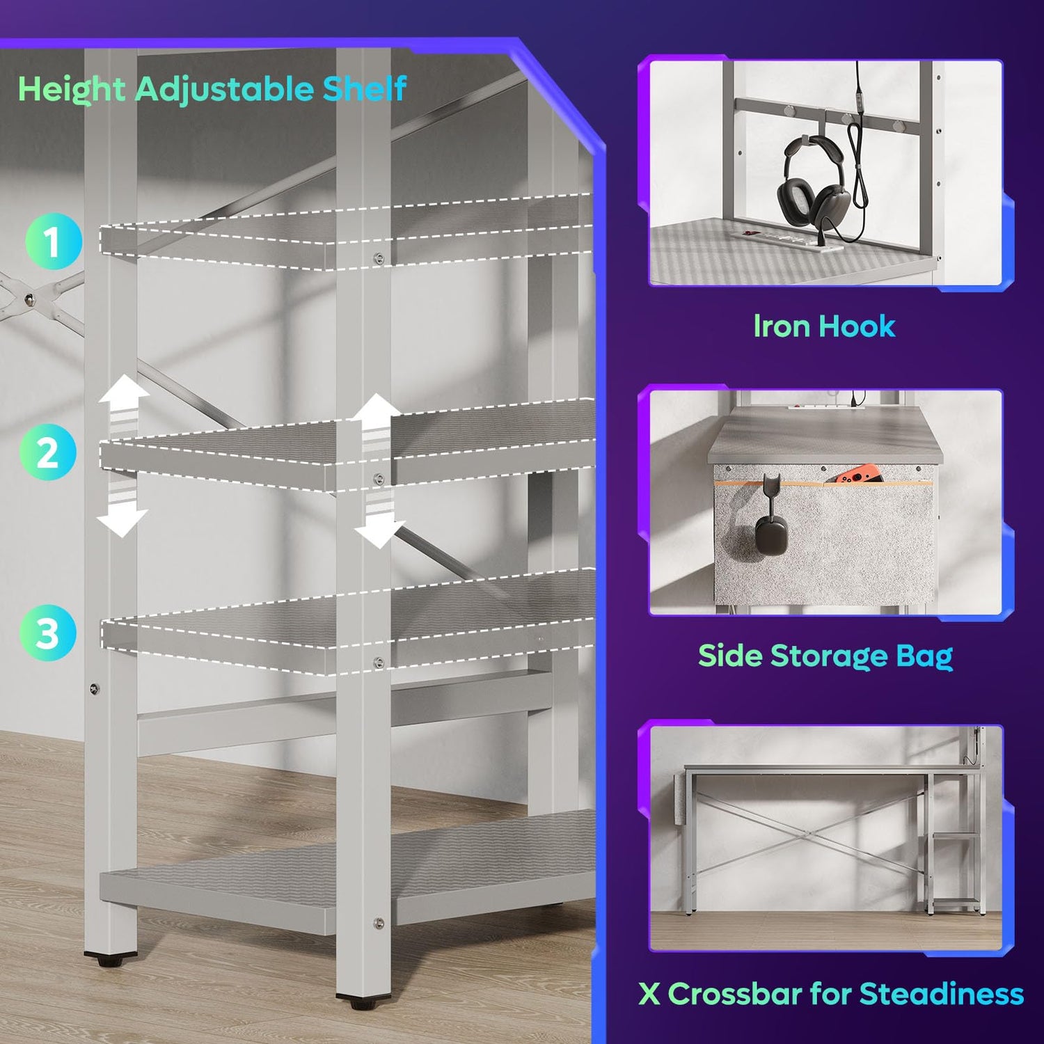 - 【Reversible Shelves & Storage Bag & Headset Hook】: The reversible shelves can be installed on the left or right side to your own personal preferences. The storage shelves provide ample storage space for your unique gaming setup and the side storage bag is perfect for storing cables or other small items, while the hook can hold accessories such as headphones, Keychain, etc