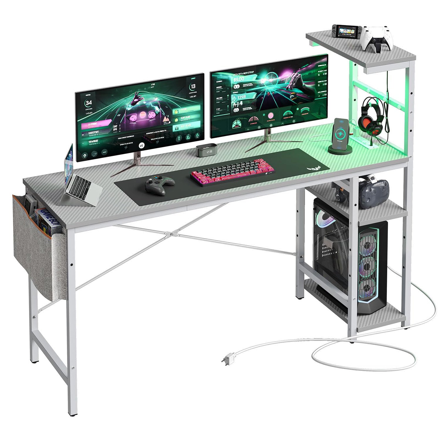 Bestier Gaming Desk with Power Outlets, 61 Inch Large Led Gamer Desk with 4 Tiers Reversible Shelves, PC Gaming Table with Headset Hook & Side Storage Bag for Bedroom (Grey 3D Carbon Fiber)