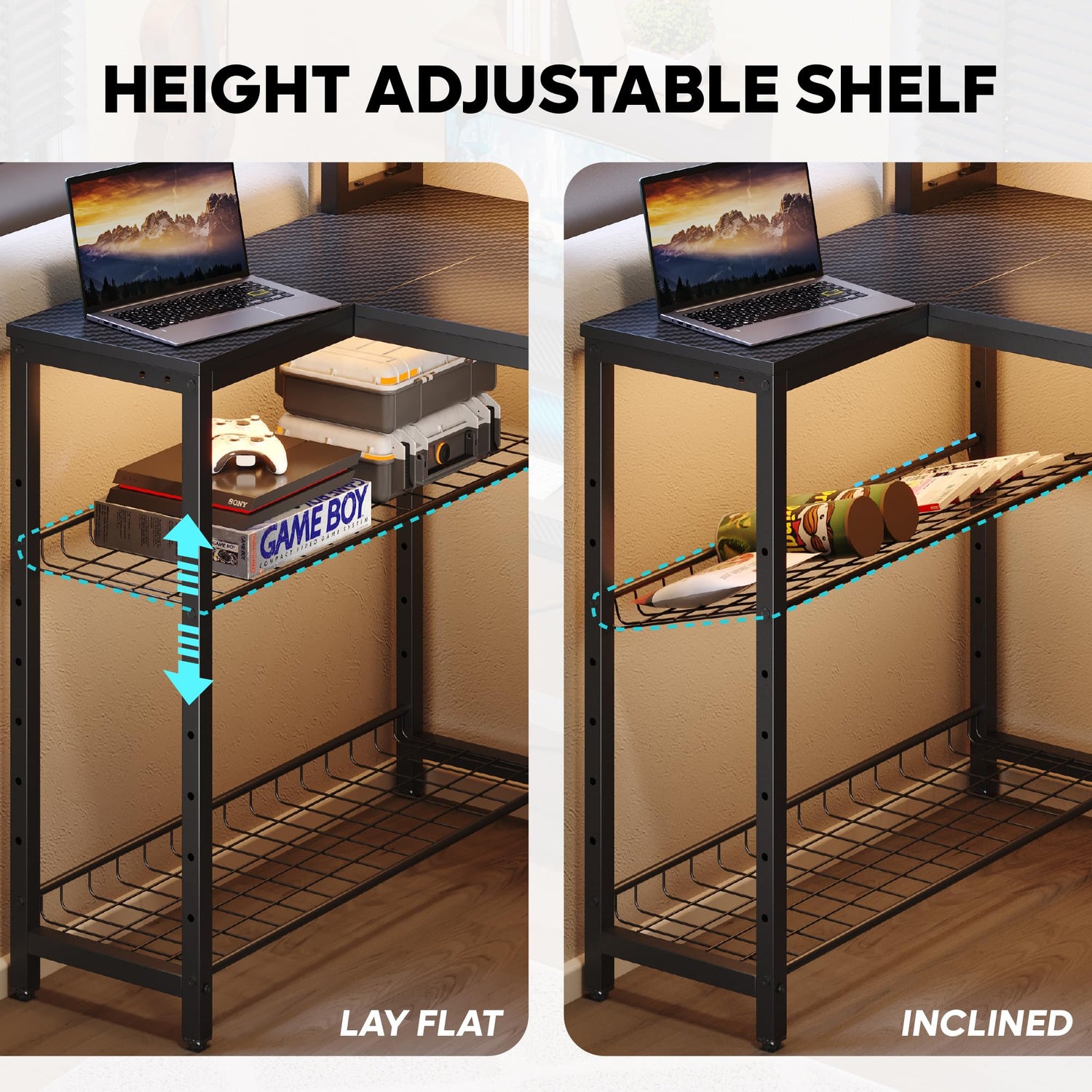 - 【Customizable Gaming Space】This computer desk’s metal grid can be set to different heights and the angle can be set to tilt. Foldable cup holder and headphone hook have 3 positions for installation. According to your usage habits and space planning, the storage racks on both sides can place your CPU stand, PS5, gaming equipment and speakers. So this gamer table will help you save space and keep your desktop organized, providing you with a comfortable gaming or working environment.