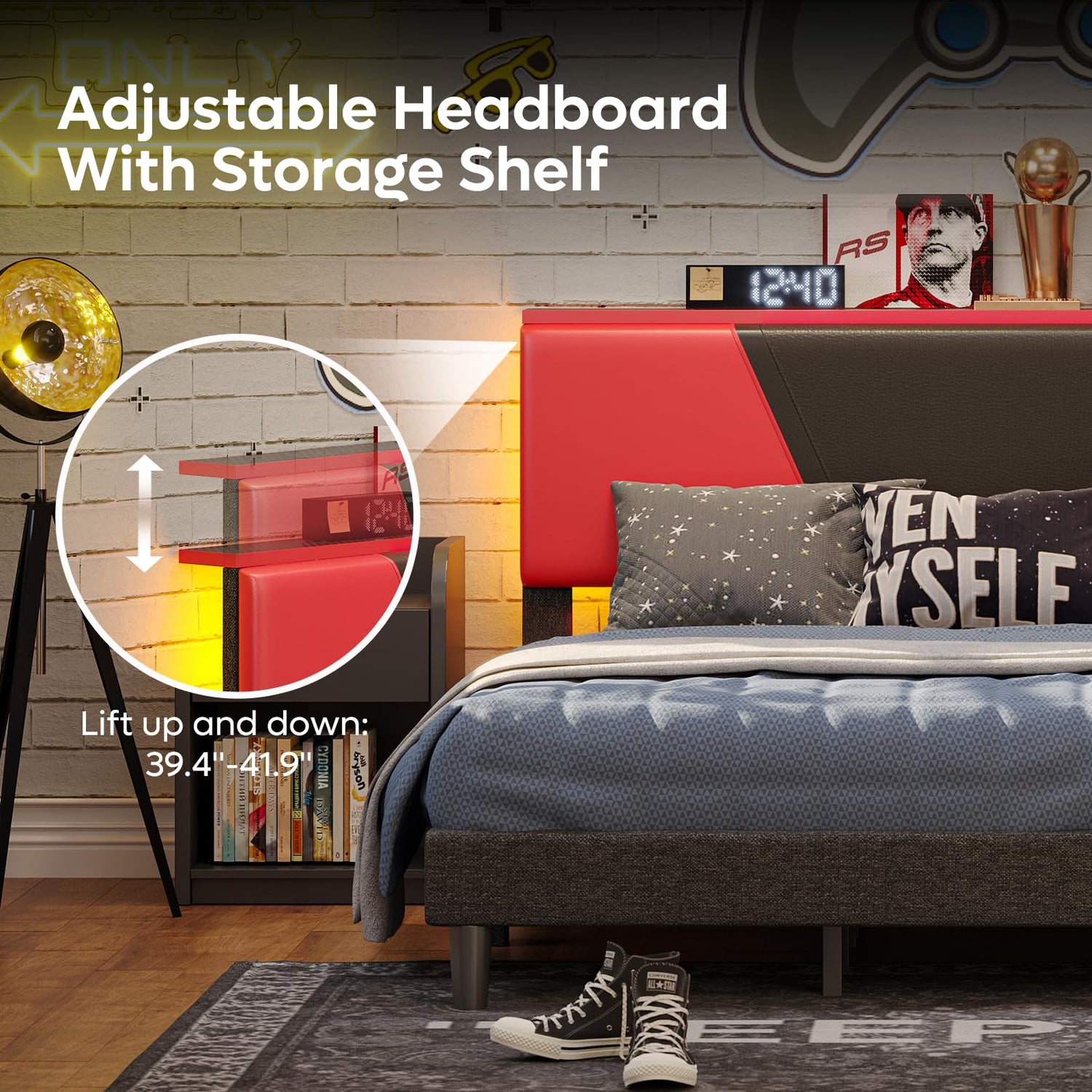 - Gaming Bed Frame: The king bed frame sports a bold black-red color scheme, perfect for adding a touch of excitement and vibrant elegance to any gamer, kid, or teen’s room