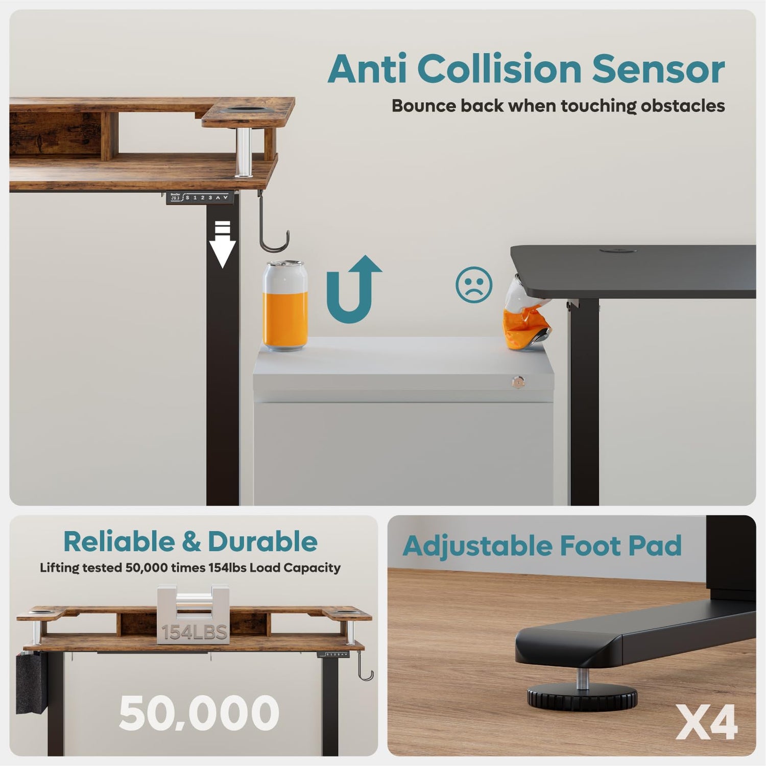 - 【Powerful Motor for Smooth Adjustment】Bestier 58 inch large electric standing desk adjustments height quietly and smoothly. Its built-in anti-collision system and strong metal legs can support up to 154 lbs/70 kg, ensuring the desk’s durability and stability. The desk’s height can be adjusted from 28.3 to 46.5 inches, with 3 preset height memory buttons for convenience.