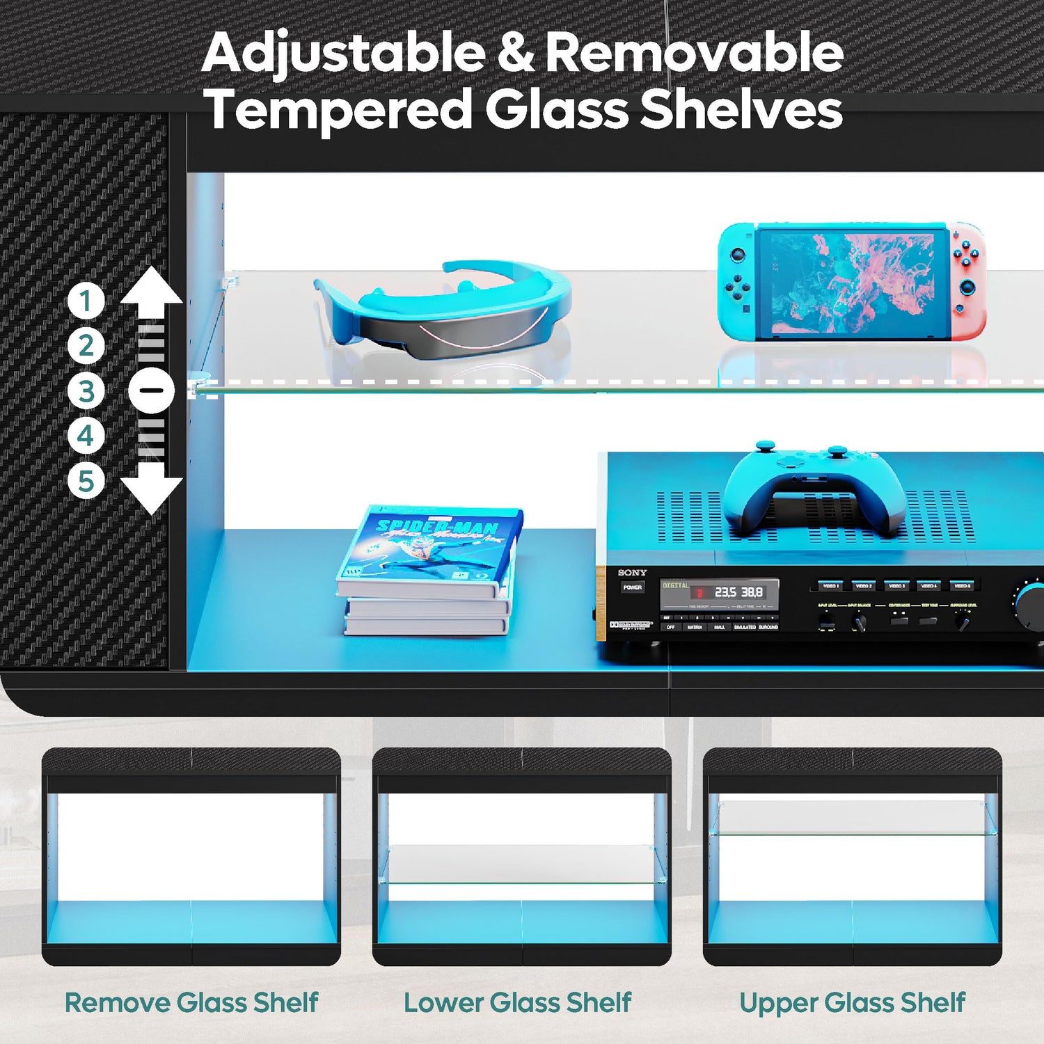 Bestier Led Entertainment Center for PS5, Gaming TV Stand with Cabinet for 60/65 Inch TV, Modern TV Console with Adjustable Glass Shelf for Living Room Easy Assembly Carbon Fiber Black