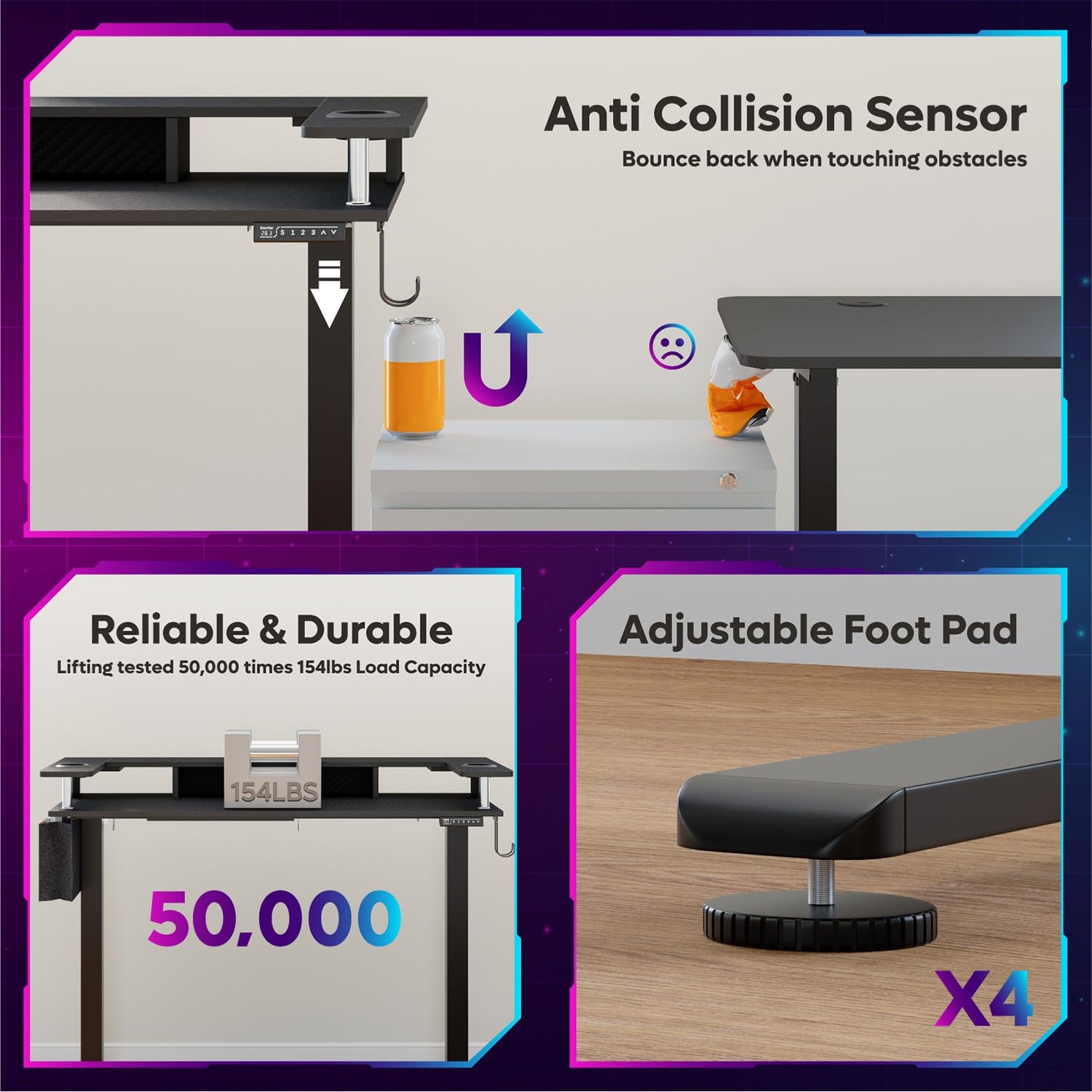 - 【Dynamic RGB Lighting】This black electric lifting desk with led lights under the monitor stand, with 20 static colors, 22 dynamic modes, and adjustable speed and brightness. Tailor your or workspace ambiance to your mood, creating a vibrant and personalized environment and improve your efficiency.