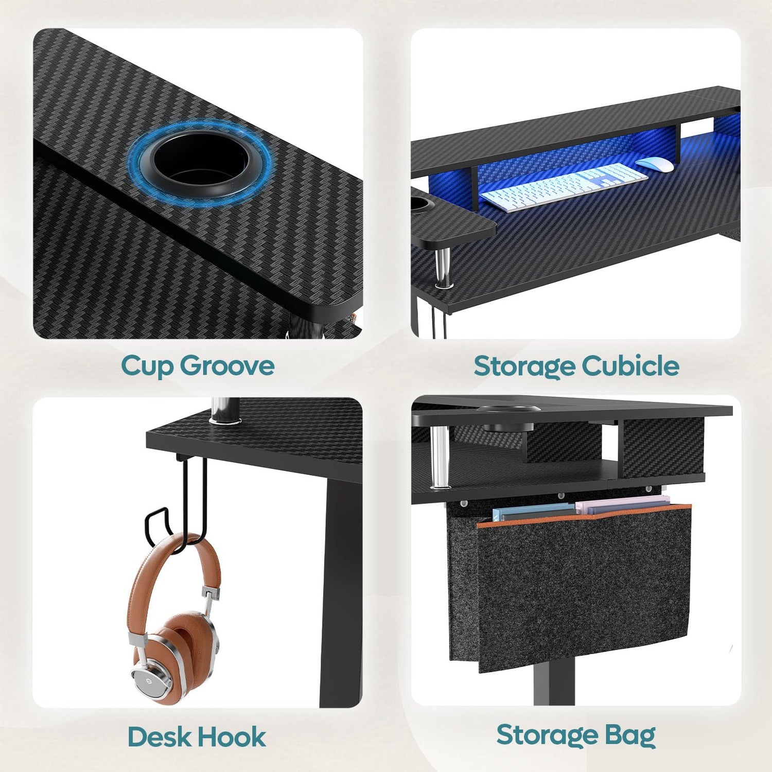 Bestier LED Gaming Electric Standing Desk Adjustable Height, 58x26 Inch Large Sit Stand Desk with Monitor Stand, Ergonomic Rising Office Desk with Headphone Hook & Storage Bag, 3D Carbon Fiber