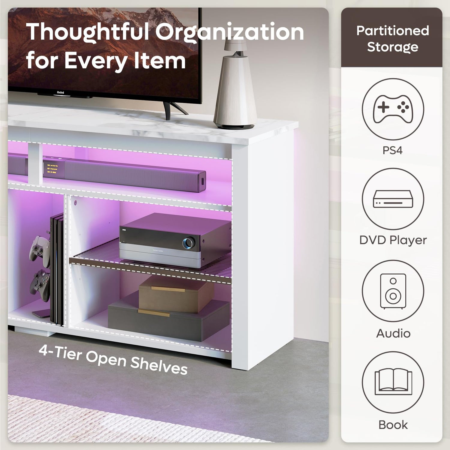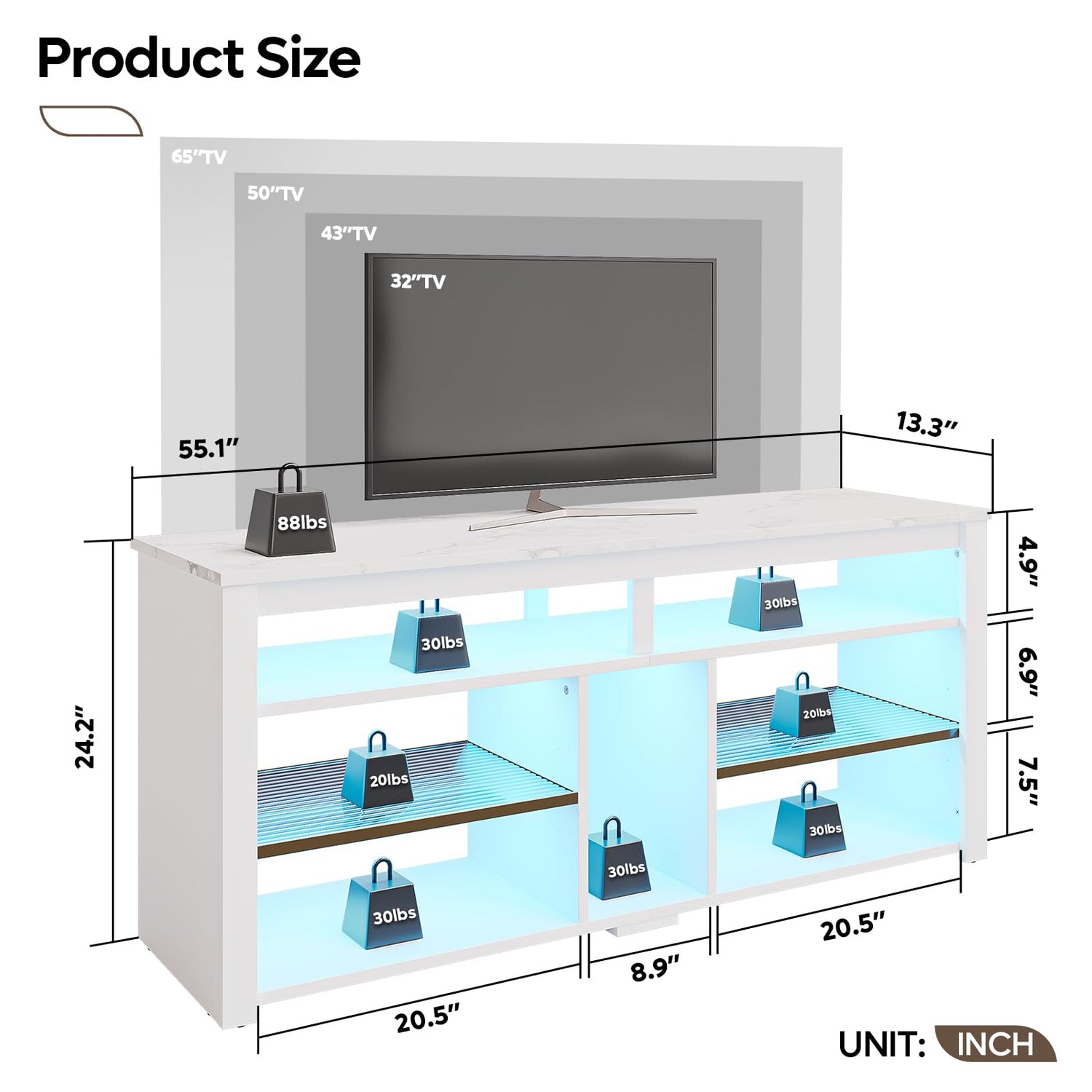 Bestier LED Tall Entertainment Center, 55 inch TV Stand for 55/60/65 inch TV, TV Console with Storage for PS5, Media TV Cabinet with Adjustable Shelf for Living Room, White Marble