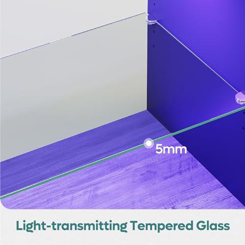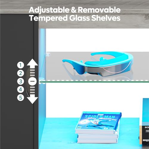 - 🎮 [Adjustable Glass Shelves]: The tempered glass middle shelves of this TV cabinet not only provide a sleek and modern look but also serve as adjustable platforms for your items. When the LED lights shine on the items you place on the shelves, your Television Stand becomes the visual focus of the room, adding a stylish touch to your living space.