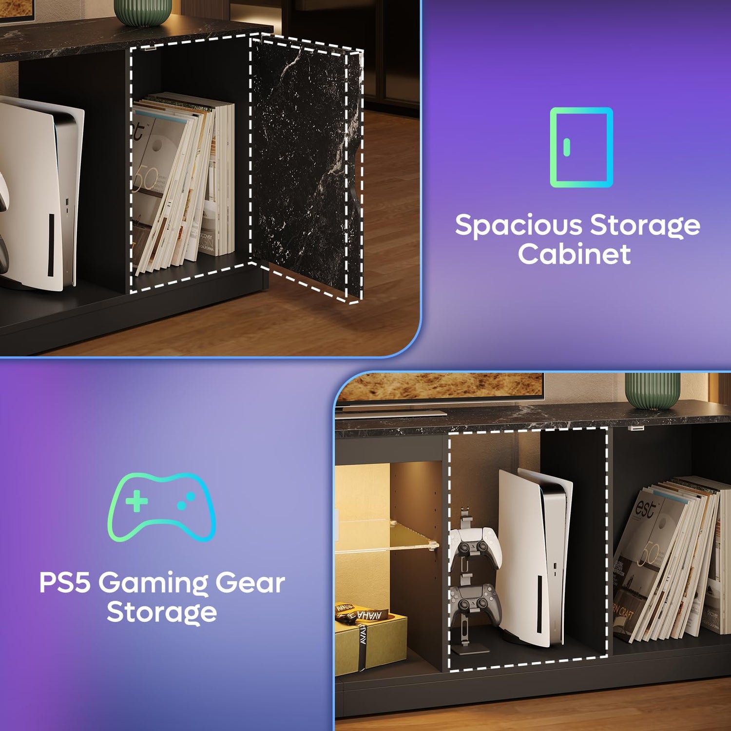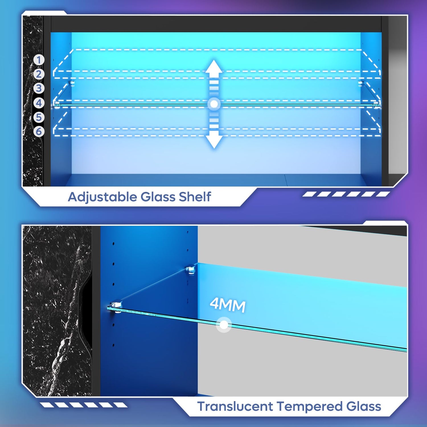 - 【Adjustable Tempered Glass Shelves】The black TV stand features adjustable tempered glass shelves that can be set to 5 different heights. These shelves offer a sturdy platform for your items. When illuminated by LED lights, your TV cabinet create an eye-catching display, show your treasured items beautifully.