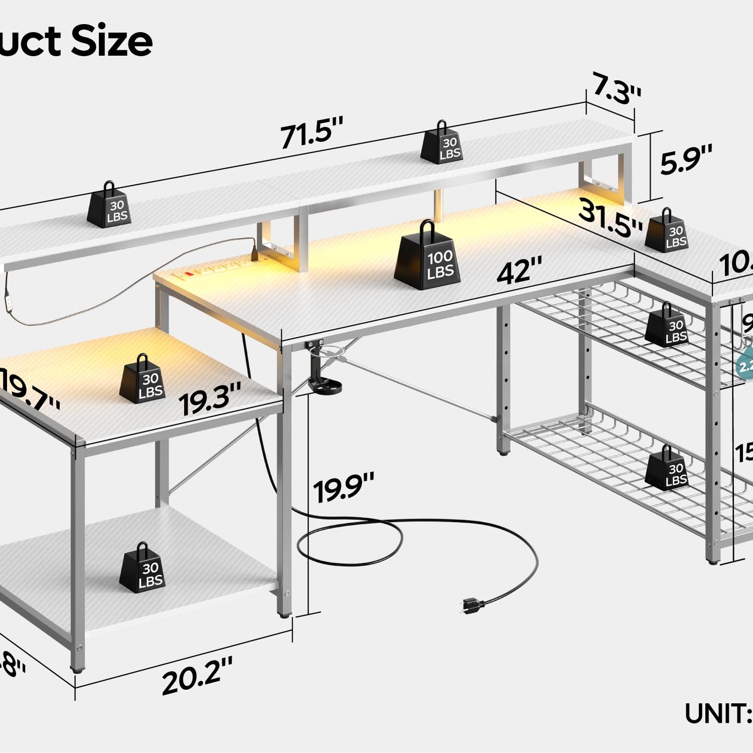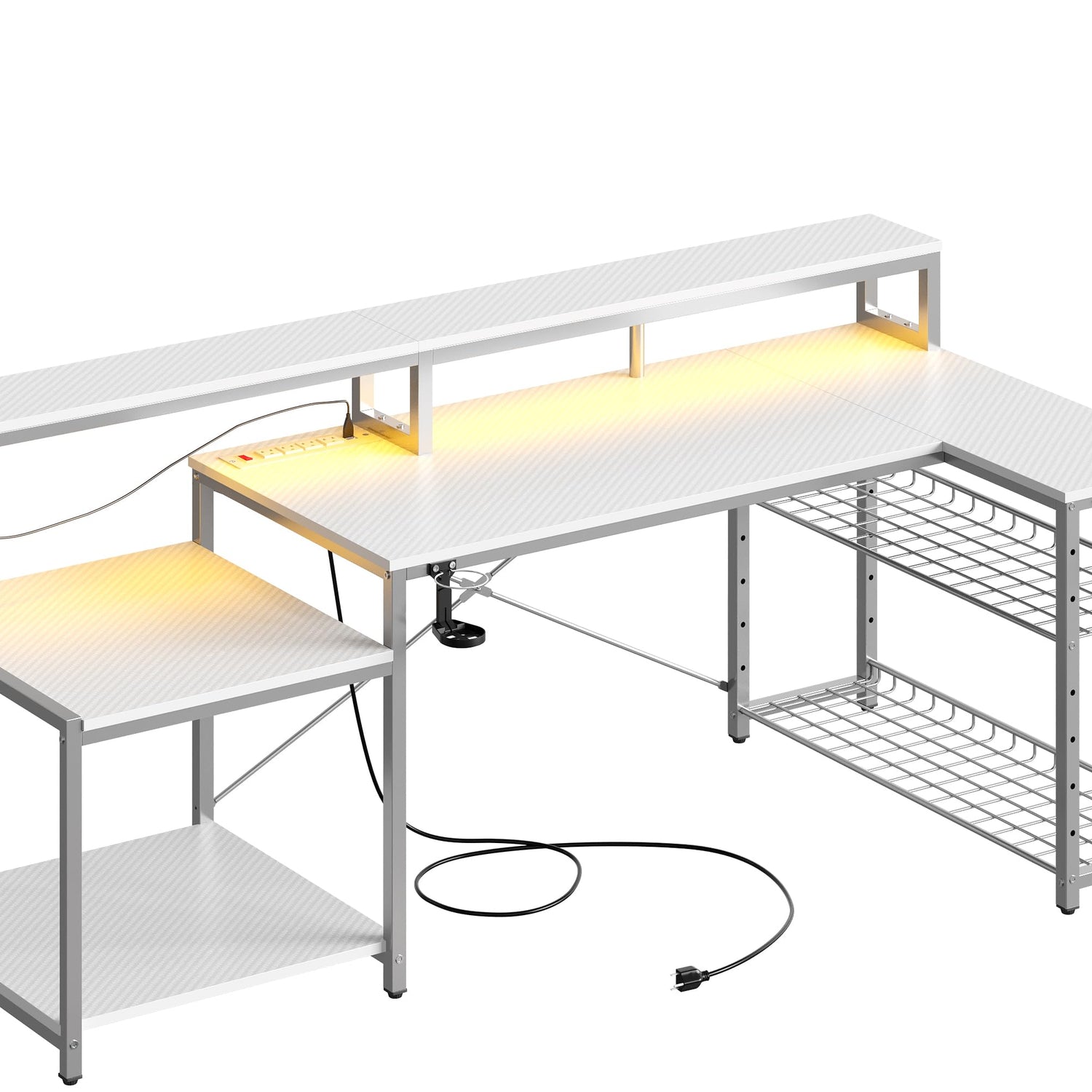 Bestier White Gaming Desk with Power Outlet, 71.5 LED Computer Desk with Monitor Stand, Large L Shaped Desk with Adjustable Shelf, Cup Holder & Headset Hooks, Corner Study Desk for Bedroom