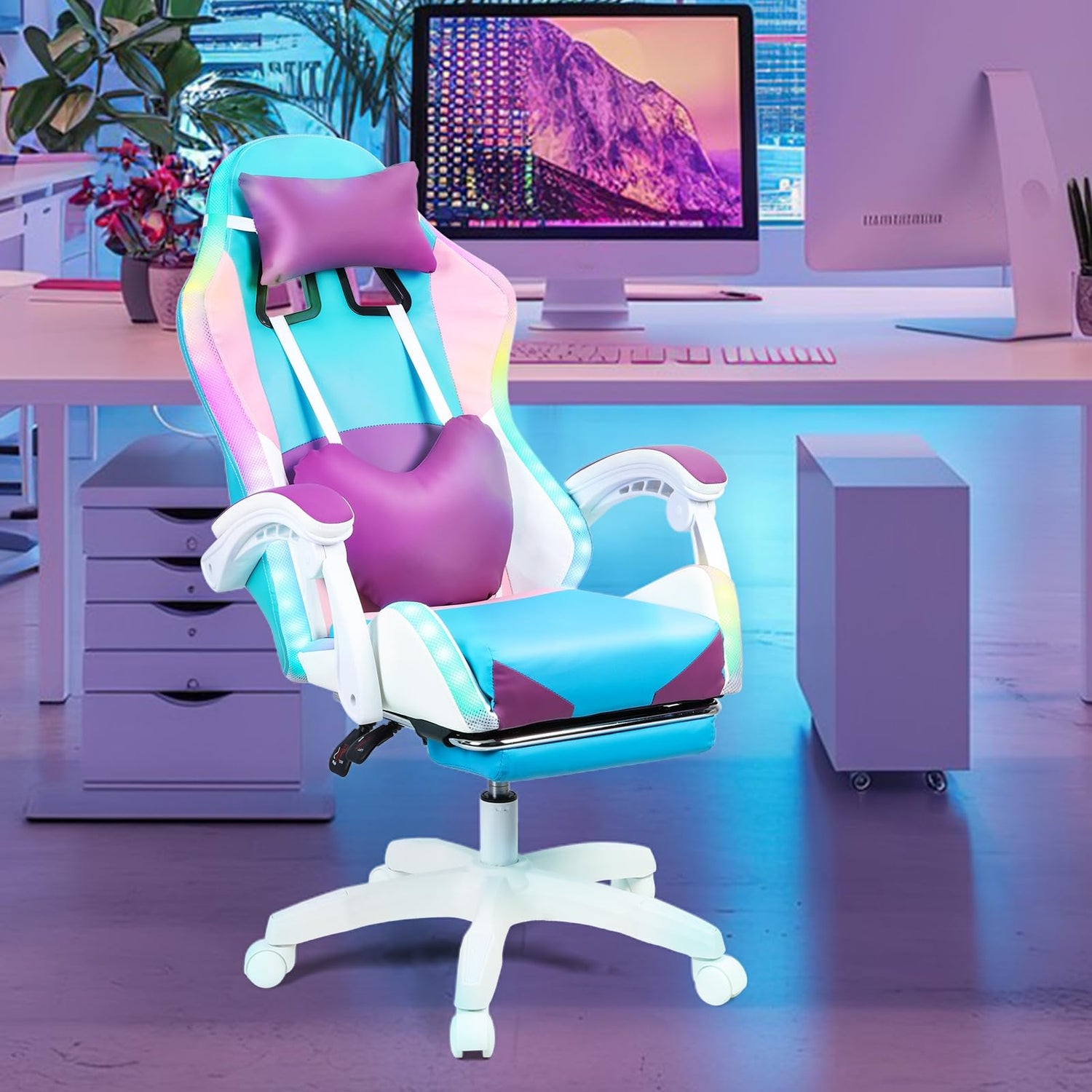 BESUFY Gaming Chair with LED Lights, Girl Video Chair, Ergonomic Computer Chair with Massage and Footrest, Heart Backrest, Height Adjustable Swivel Reclining Video Game Chairs for Adults Purple