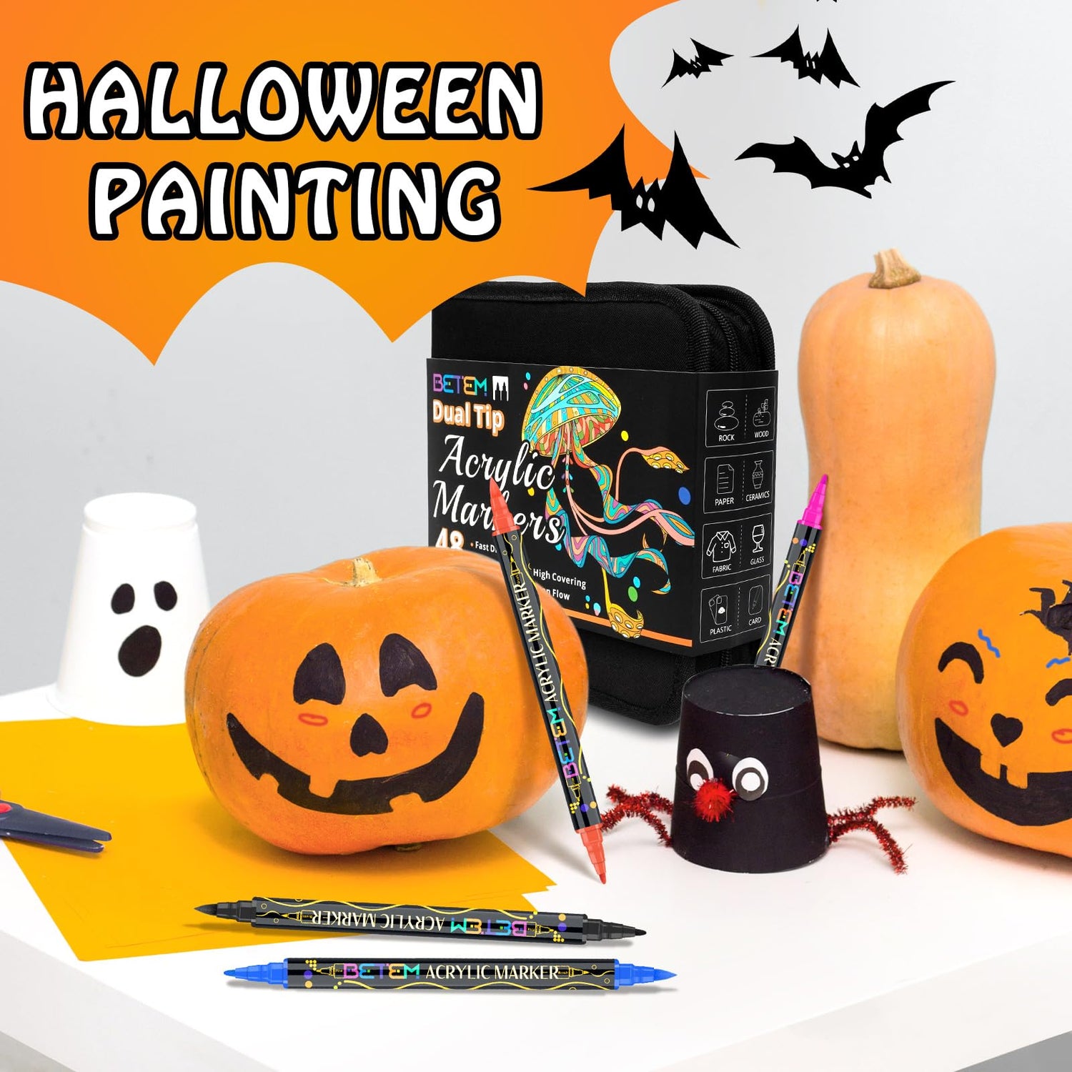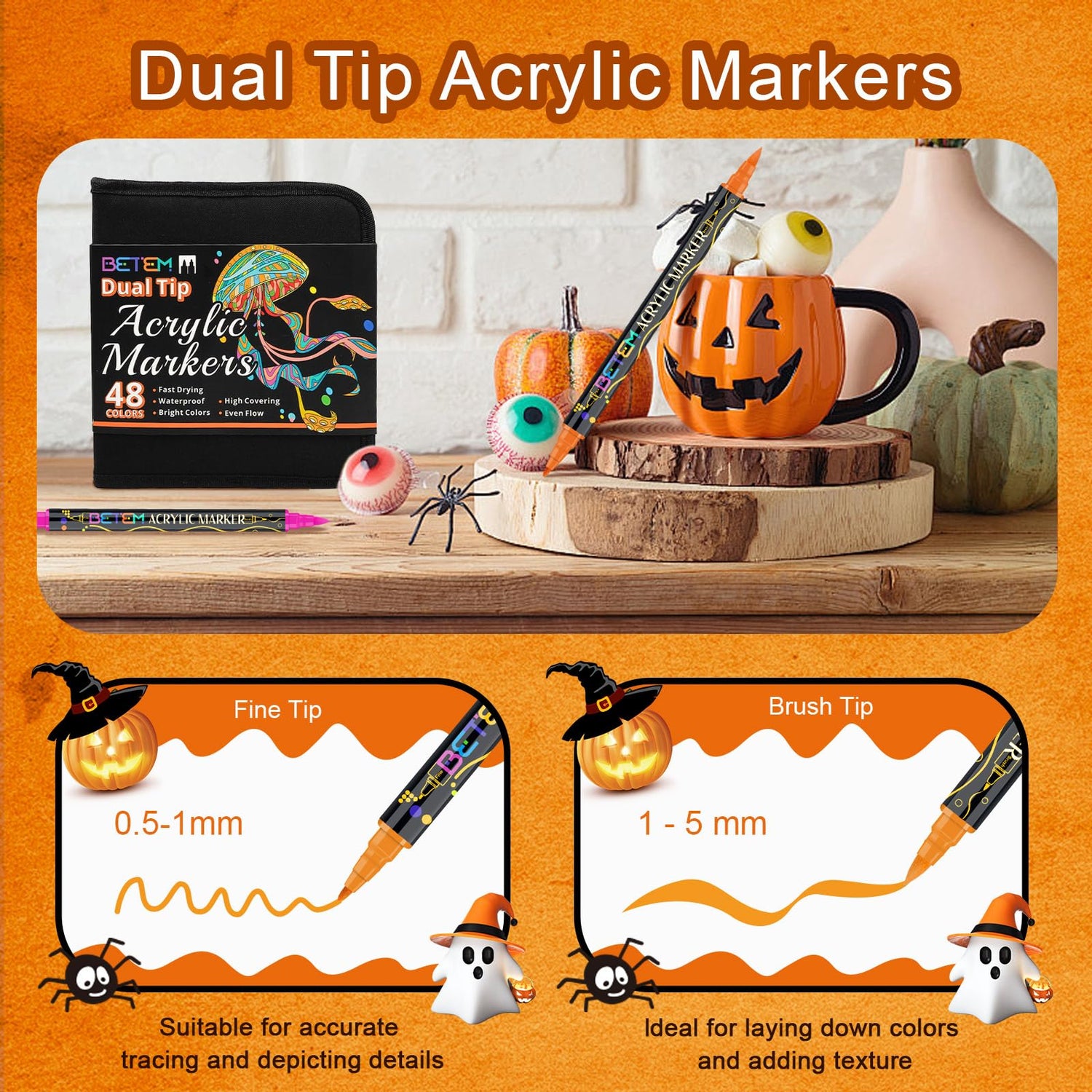 Betem 48 Colors Paint Markers Acrylic Paint Pens, Dual Tip with Brush Tip and Fine Tip, Art Supplies for Rock Painting, Wood, Canvas, Stone, Glass, Ceramic, DIY Crafts Making Drawing Kit with Bag