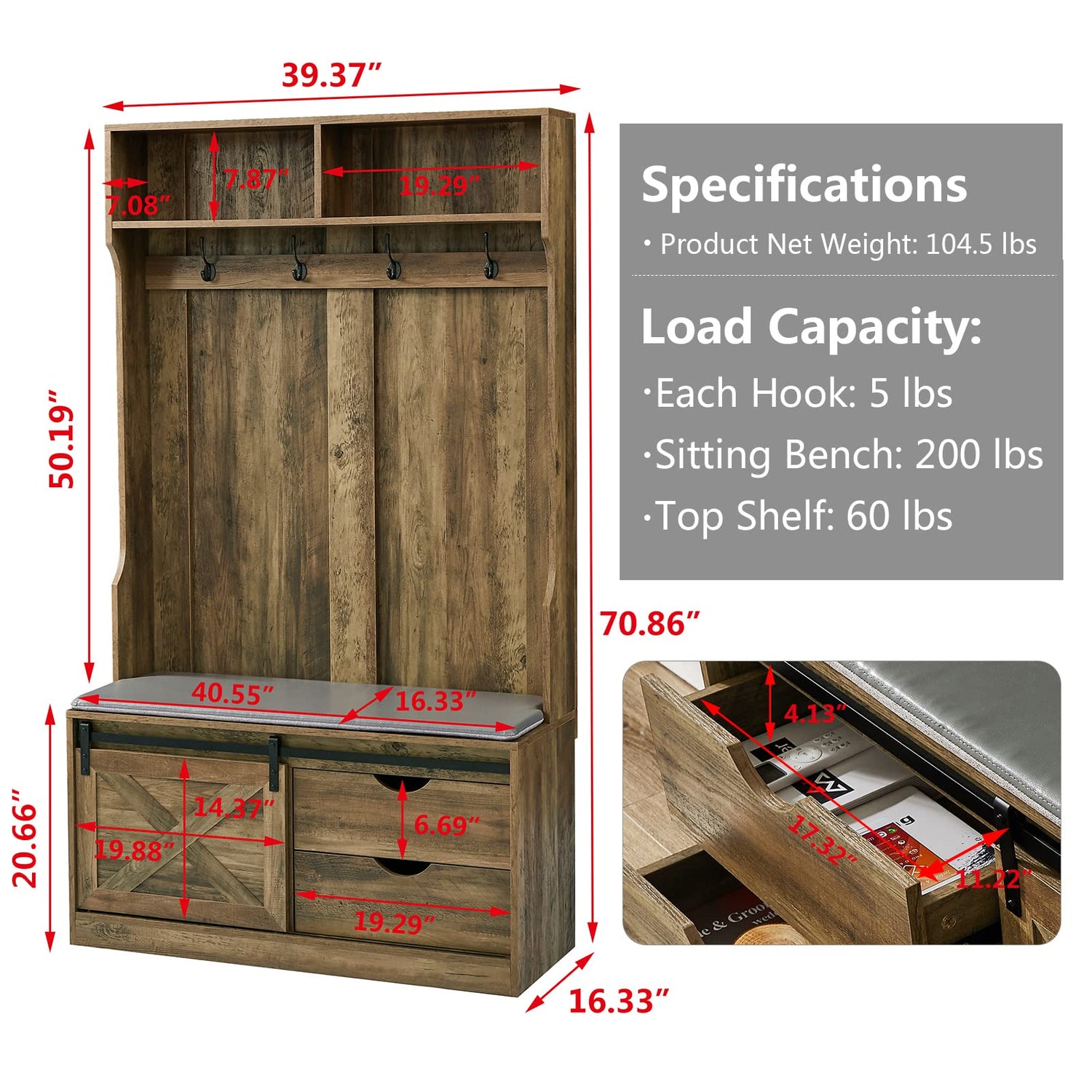 Betoko 71 Inch Entryway Bench with Sliding Barn Door, Farmhouse Hall Tree with Coat Rack and Storage Bench, Wood Coat Tree with Cushioned Stool and Hooks for Hallway, Living Room, Mudroom (Oak)